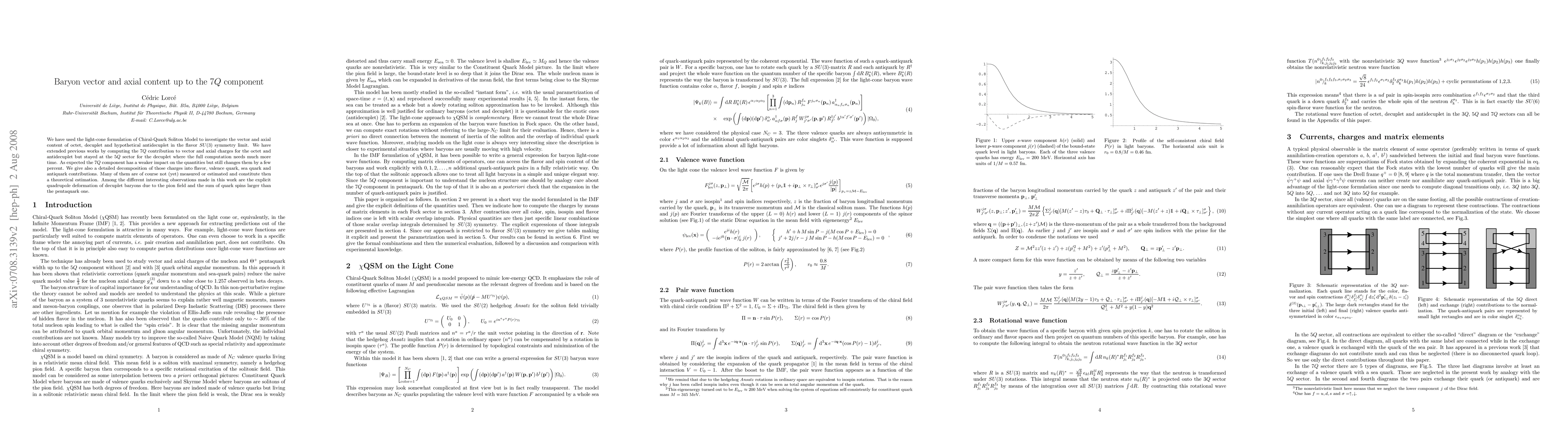 We have used the light-cone formulation of Chiral-Quark Soliton Model to investigate the vector and axial content of octet, decuplet and the hypothetical antidecuplet in the flavor SU(3) symmetry limit. We have extended previous works by computing the 7Q contribution to vector and axial charges for the octet and antidecuplet but stayed at the 5Q sector for the decuplet where the full computation needs much more time. As expected the 7Q component has a weaker impact on the quantities but still changes them by a few percent. We give also a detailed decomposition of those charges into flavor, valence quark, sea quark and antiquark contributions. Many of them are of course not (yet) measured or estimated and constitute then a theoretical estimation. Among the different interesting observations made in this work are the explicit quadrupole deformation of decuplet baryons due to the pion field and the sum of quark spins larger than the pentaquark one.