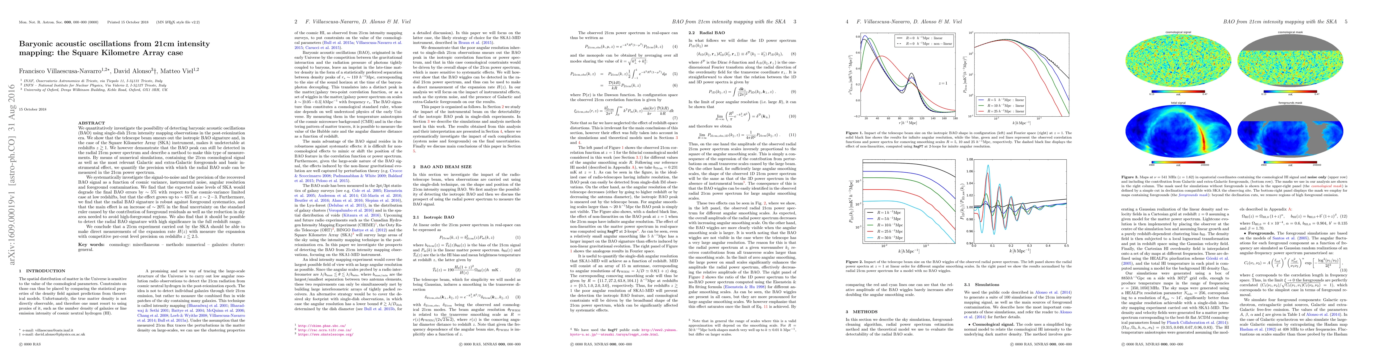 This paper investigates the feasibility of detecting baryonic acoustic oscillations (BAO) using 21cm intensity mapping with the Square Kilometre Array (SKA). It finds that while the telescope beam makes the isotropic BAO signature undetectable at high redshifts, the radial BAO peak can still be detected in the 21cm power spectrum, allowing for precise measurements of the expansion rate $H(z)$ up to redshifts $z\lesssim2.5$, despite noise and foreground contamination.
