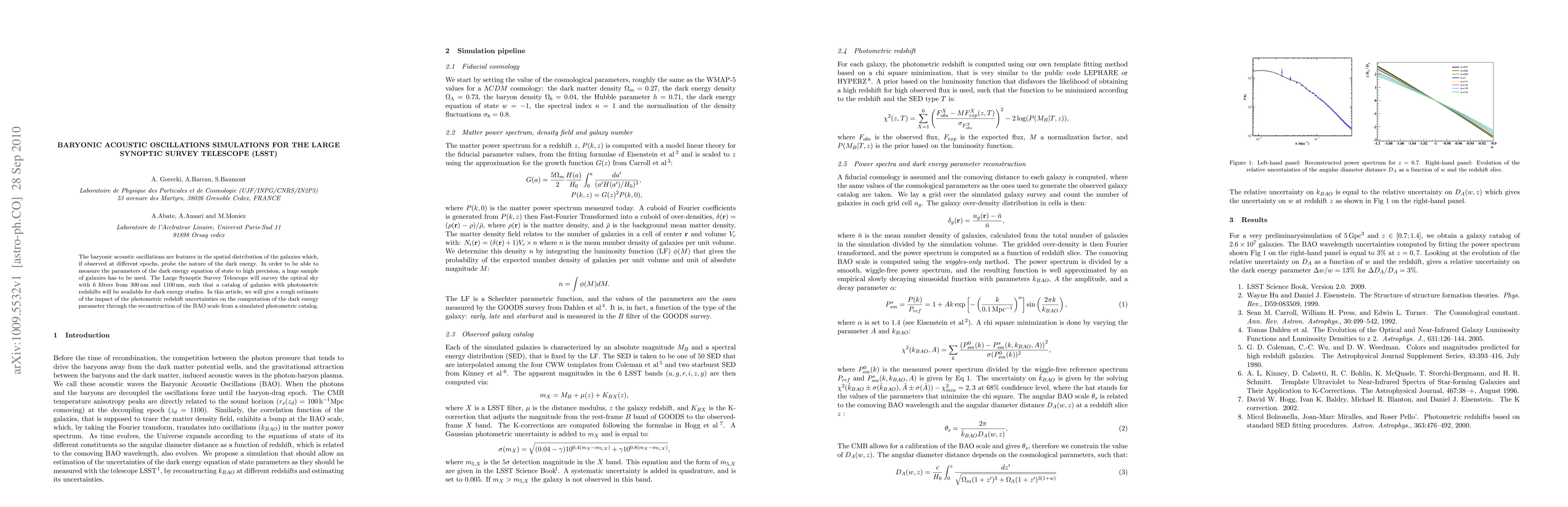 The baryonic acoustic oscillations are features in the spatial distribution of the galaxies which, if observed at different epochs, probe the nature of the dark energy. In order to be able to measure the parameters of the dark energy equation of state to high precision, a huge sample of galaxies has to be used. The Large Synoptic Survey Telescope will survey the optical sky with 6 filters from 300nm and 1100nm, such that a catalog of galaxies with photometric redshifts will be available for dark energy studies. In this article, we will give a rough estimate of the impact of the photometric redshift uncertainties on the computation of the dark energy parameter through the reconstruction of the BAO scale from a simulated photometric catalog.