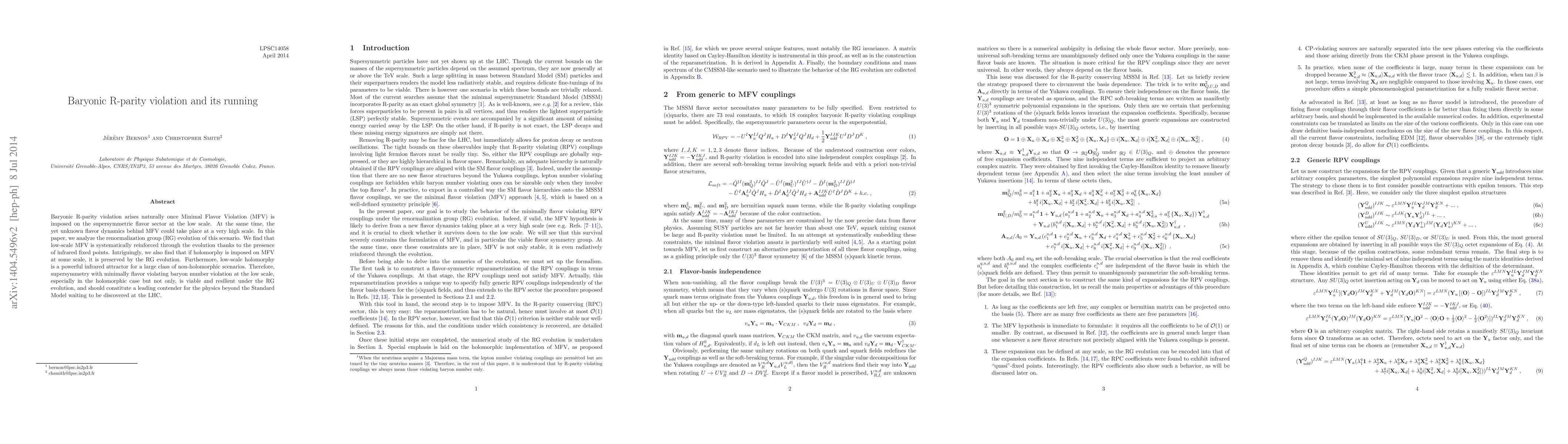 This paper investigates the renormalization group evolution of baryonic R-parity violation under Minimal Flavor Violation, finding that low-scale MFV is reinforced and that holomorphy, if imposed, is preserved. It concludes that supersymmetry with low-scale baryon number violation, especially holomorphic, is a viable candidate for physics beyond the Standard Model.