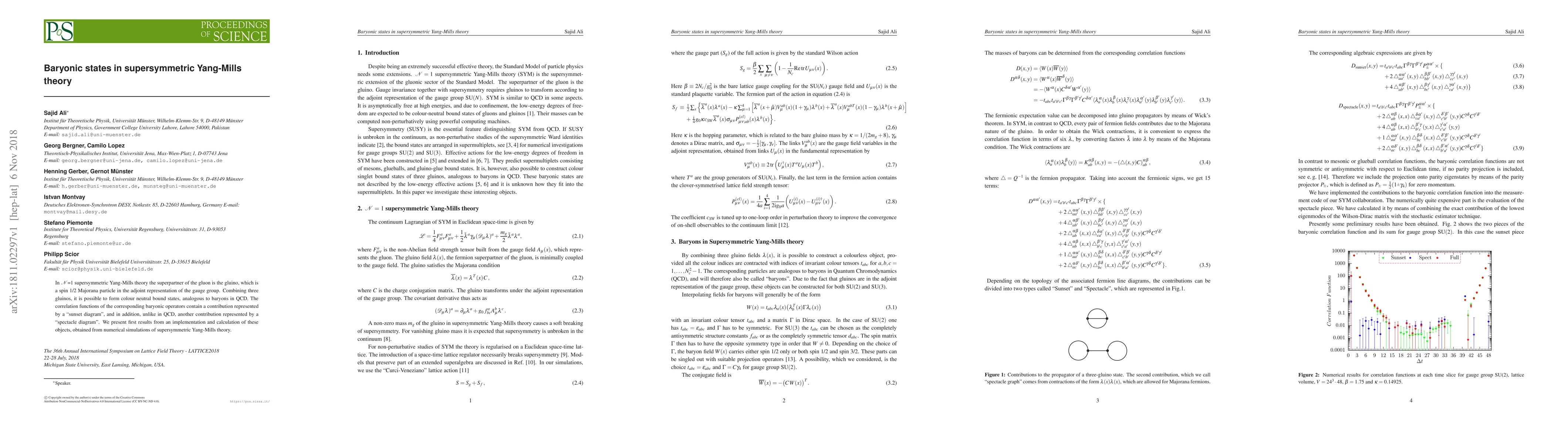 This paper investigates baryonic states in $\mathcal{N}=1$ supersymmetric Yang-Mills theory, focusing on the gluino's superpartner role and the formation of colour-neutral bound states akin to baryons. It identifies unique correlation functions, including 'sunset' and 'spectacle' diagrams, and reports initial numerical simulation results for these contributions.