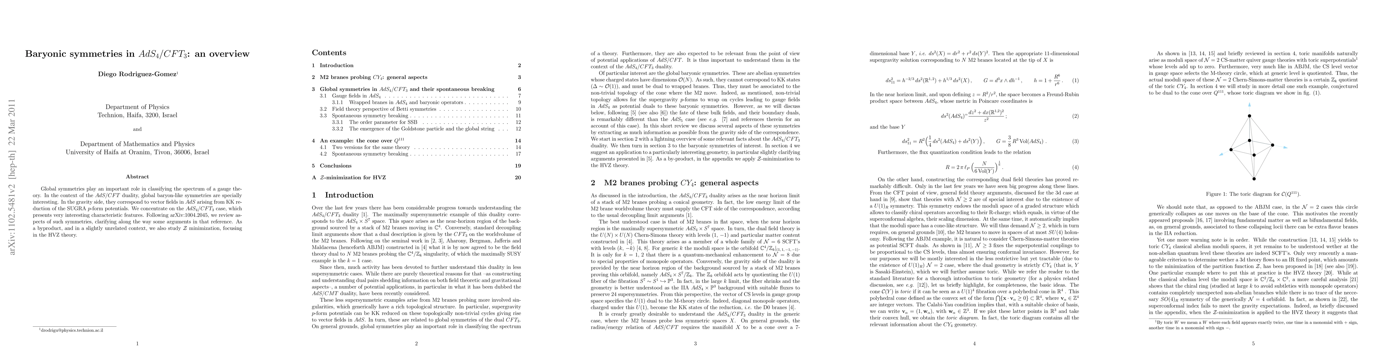 This paper reviews global baryon-like symmetries in the AdS_4/CFT_3 duality, focusing on vector fields in AdS derived from Kaluza-Klein reductions of supergravity p-form potentials. It clarifies certain arguments from a previous reference and explores Z-minimization in the HVZ theory as a secondary topic.
