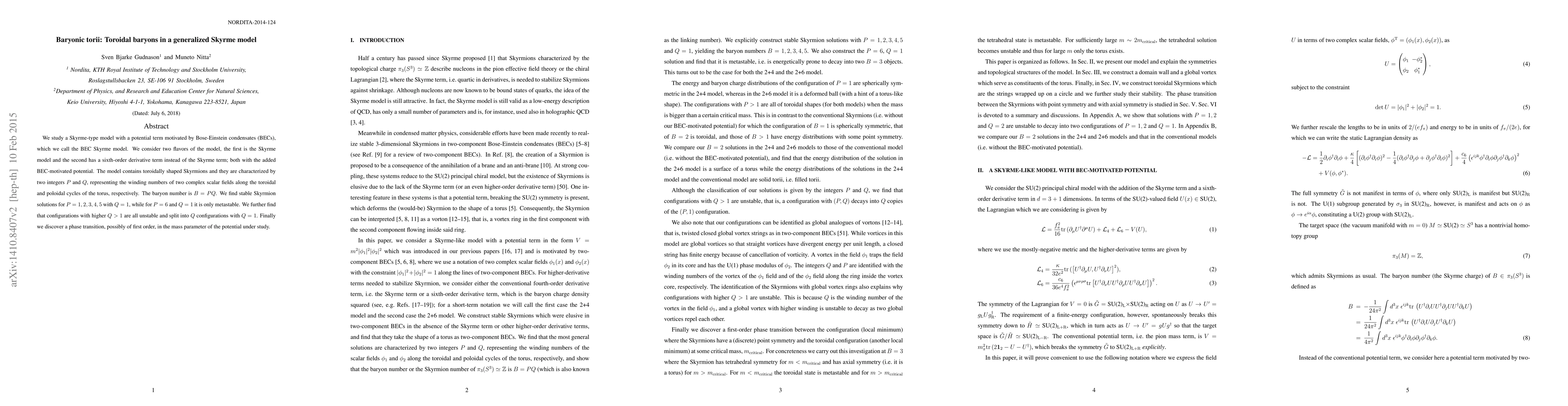This paper explores a generalized Skyrme model with a Bose-Einstein condensate-inspired potential term, identifying toroidal baryons characterized by winding numbers P and Q. Stable toroidal Skyrmions are found for P=1-5 with Q=1, while P=6 is only metastable, and higher Q configurations are unstable.