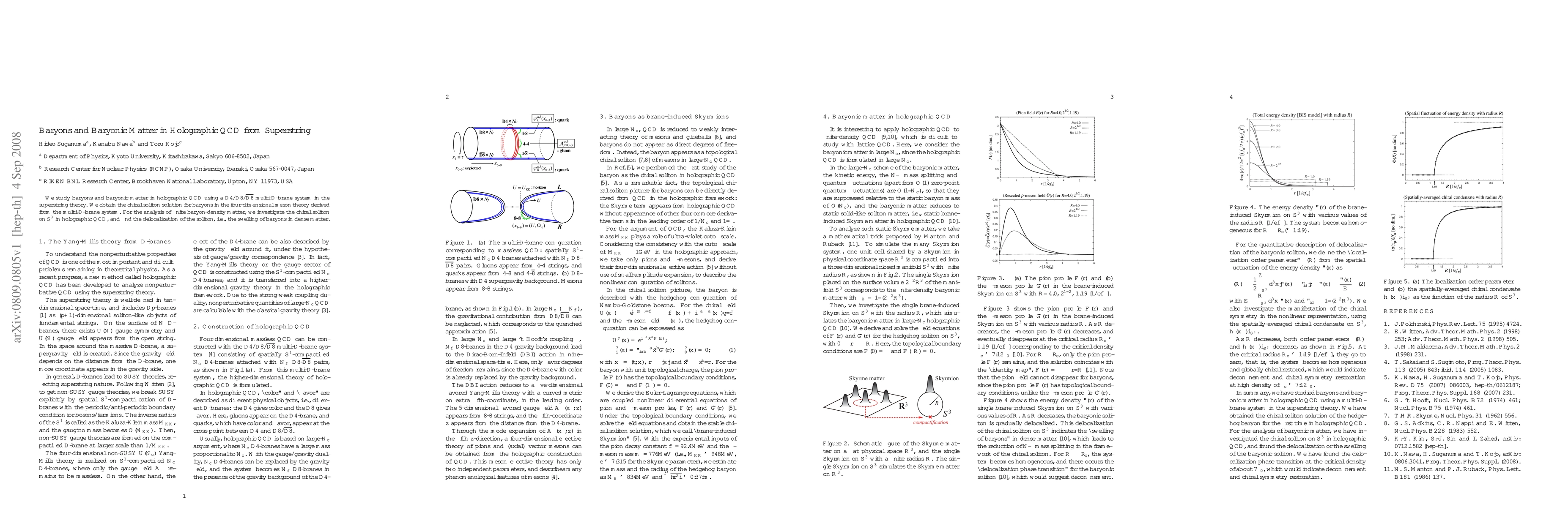 This paper explores baryons and baryonic matter in holographic QCD using a D4/D8/$\bar{\rm D8}$ multi-D-brane system in superstring theory, deriving a chiral soliton solution for baryons and observing the swelling of baryons in dense matter due to soliton delocalization.