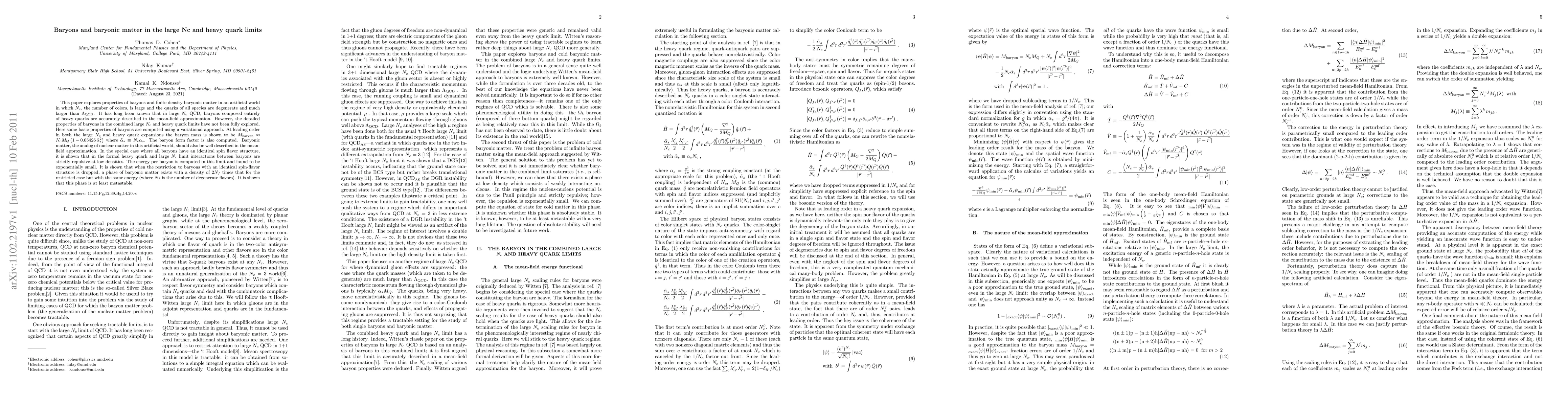 This paper investigates baryon properties and baryonic matter in a theoretical framework where the number of colors (Nc) is large and quarks are heavy and degenerate. It computes baryon mass and form factors using a variational approach, revealing repulsive interactions between baryons at low densities in the large Nc and heavy quark limits, and identifies a metastable phase of baryonic matter with higher density.