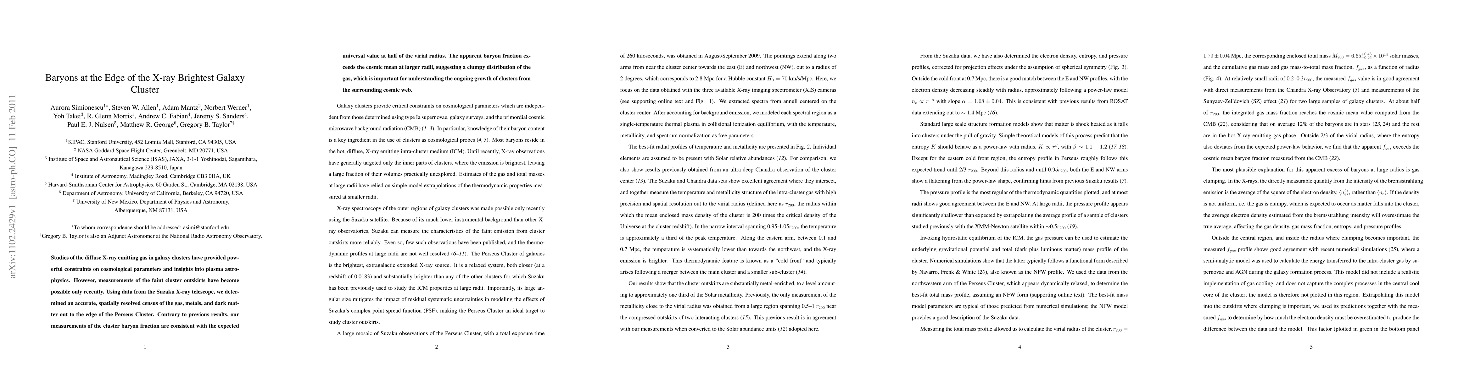 Studies of the diffuse X-ray emitting gas in galaxy clusters have provided powerful constraints on cosmological parameters and insights into plasma astrophysics. However, measurements of the faint cluster outskirts have become possible only recently. Using data from the Suzaku X-ray telescope, we determined an accurate, spatially resolved census of the gas, metals, and dark matter out to the edge of the Perseus Cluster. Contrary to previous results, our measurements of the cluster baryon fraction are consistent with the expected universal value at half of the virial radius. The apparent baryon fraction exceeds the cosmic mean at larger radii, suggesting a clumpy distribution of the gas, which is important for understanding the ongoing growth of clusters from the surrounding cosmic web.