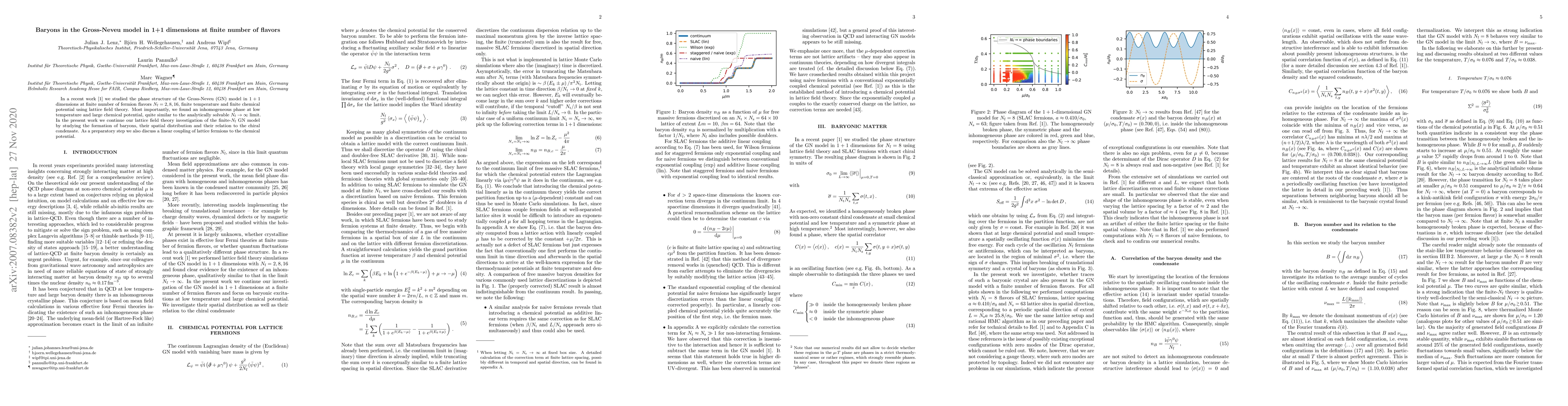 This paper investigates baryon formation in the Gross-Neveu model in 1+1 dimensions with finite fermion flavors using lattice field theory, focusing on their spatial distribution and relation to the chiral condensate. It builds on previous findings of an inhomogeneous phase and explores the linear coupling of lattice fermions to the chemical potential.