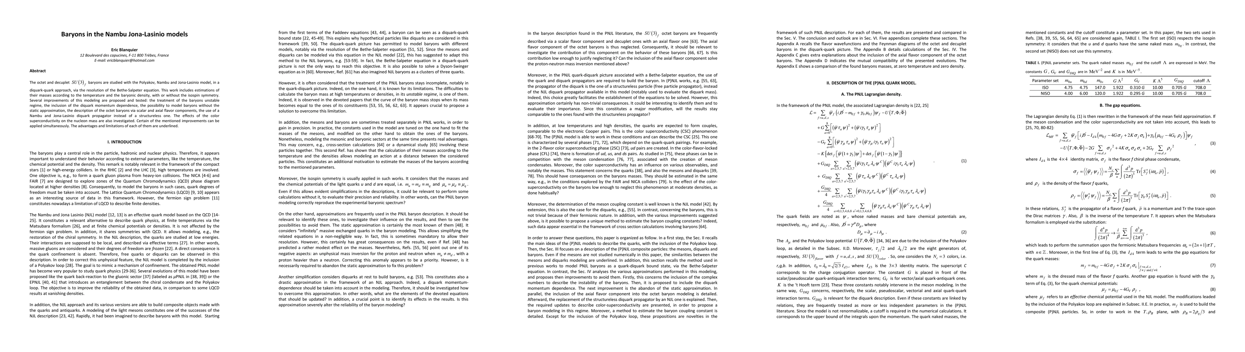 The octet and decuplet SU(3)f baryons are studied with the Polyakov, Nambu and Jona-Lasinio model, in a diquark-quark approach, via the resolution of the Bethe-Salpeter equation. This work includes estimations of their masses according to the temperature and the baryonic density, with or without the isospin symmetry. Several improvements of this modeling are proposed and tested: the treatment of the baryons unstable regime, the inclusion of the diquark momentum dependence, the possibility to model baryons without the static approximation, the description of the octet baryons via scalar and axial flavor components, the use of a Nambu and Jona-Lasinio diquark propagator instead of a structureless one. The effects of the color superconductivity on the nucleon mass are also investigated. Certain of the mentioned improvements can be applied simultaneously. The advantages and limitations of each of them are underlined.