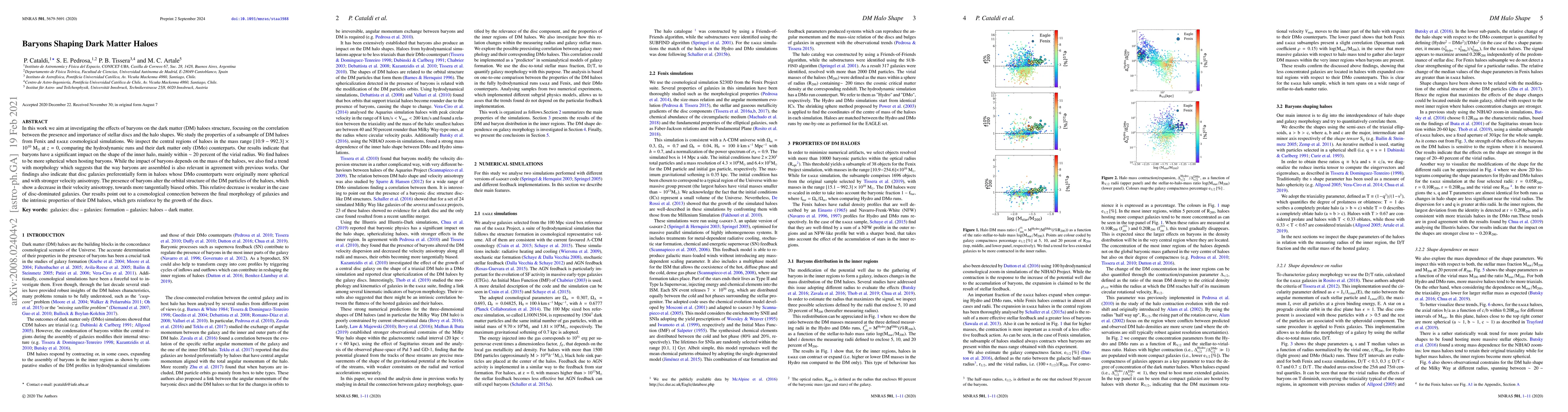 The paper presents a detailed analysis of DM halo shapes in the presence of baryons, utilizing cosmological simulations to identify the impact of stellar discs and baryonic physics on halo triaxiality.