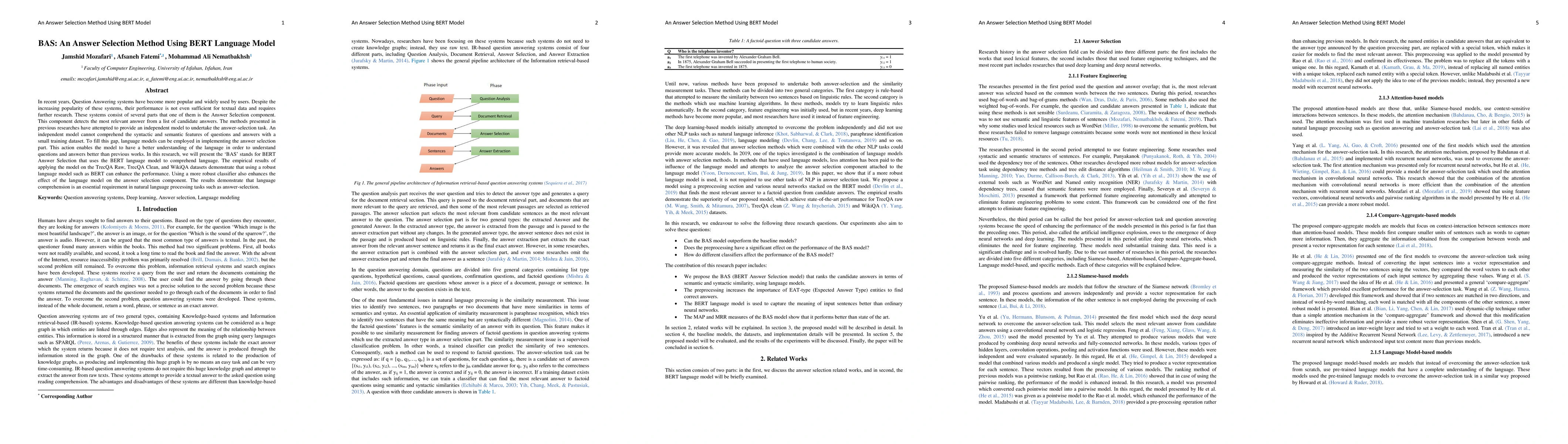 A new answer selection method called BAS uses BERT language model to improve performance on question-answering systems, achieving better results on TrecQA Raw, TrecQA Clean, and WikiQA datasets.