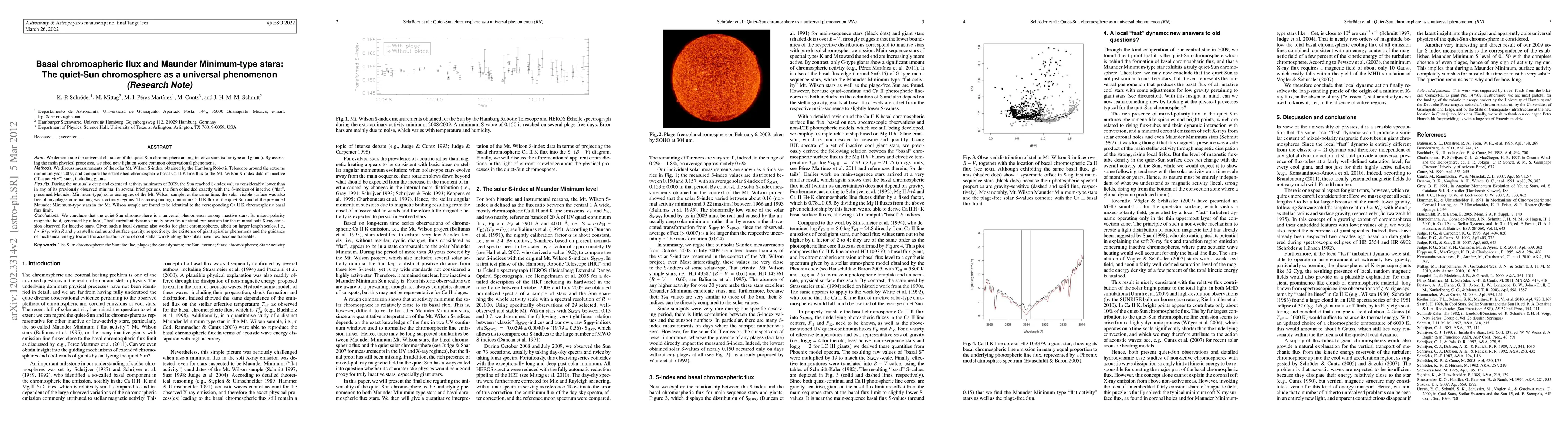 Aims: We demonstrate the universal character of the quiet-Sun chromosphere among inactive stars (solar-type and giants). By assessing the main physical processes, we shed new light on some common observational phenomena. Methods: We discuss measurements of the solar Mt. Wilson S-index, obtained by the Hamburg Robotic Telescope around the extreme minimum year 2009, and compare the established chromospheric basal Ca II K line flux to the Mt. Wilson S-index data of inactive ("flat activity") stars, including giants. Results: During the unusually deep and extended activity minimum of 2009, the Sun reached S-index values considerably lower than in any of its previously observed minima. In several brief periods, the Sun coincided exactly with the S-indices of inactive ("flat", presumed Maunder Minimum-type) solar analogues of the Mt. Wilson sample; at the same time, the solar visible surface was also free of any plages or remaining weak activity regions. The corresponding minimum Ca II K flux of the quiet Sun and of the presumed Maunder Minimum-type stars in the Mt. Wilson sample are found to be identical to the corresponding Ca II K chromospheric basal flux limit. Conclusions: We conclude that the quiet-Sun chromosphere is a universal phenomenon among inactive stars. Its mixed-polarity magnetic field, generated by a local, "fast" turbulent dynamo finally provides a natural explanation for the minimal soft X-ray emission observed for inactive stars. Given such a local dynamo also works for giant chromospheres, albeit on larger length scales, i.e., l ~ R/g, with R and g as stellar radius and surface gravity, respectively, the existence of giant spicular phenomena and the guidance of mechanical energy toward the acceleration zone of cool stellar winds along flux-tubes have now become traceable.