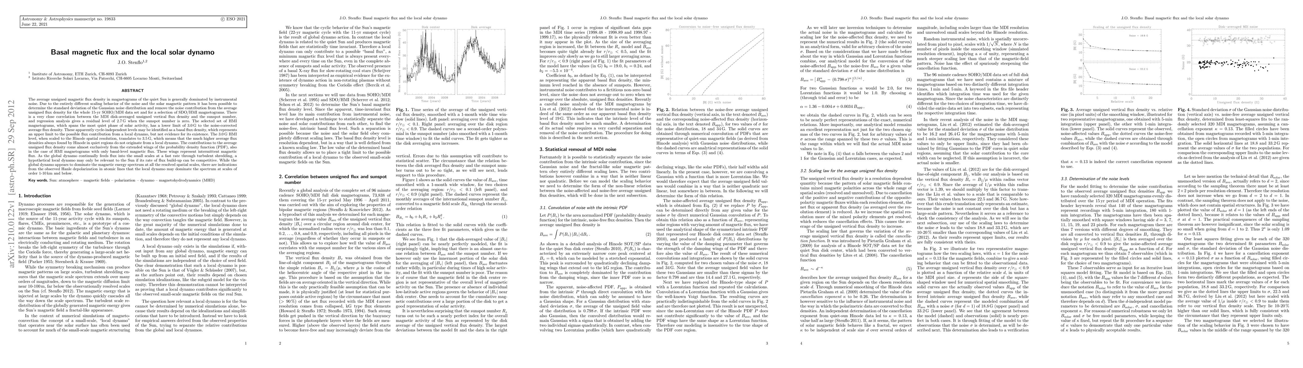 The average unsigned magnetic flux density in magnetograms of the quiet Sun is generally dominated by instrumental noise. Due to the entirely different scaling behavior of the noise and the solar magnetic pattern it has been possible to determine the standard deviation of the Gaussian noise distribution and remove the noise contribution from the average unsigned flux density for the whole 15-yr SOHO/MDI data set and for a selection of SDO/HMI magnetograms. There is a very close correlation between the MDI disk-averaged unsigned vertical flux density and the sunspot number, and regression analysis gives a residual level of 2.7 G when the sunspot number is zero. The selected set of HMI magnetograms, which spans the most quiet phase of solar activity, has a lower limit of 3.0 G to the noise-corrected average flux density. These apparently cycle-independent levels may be identified as a basal flux density, which represents an upper limit to the possible flux contribution from a local dynamo, but not evidence for its existence. The 3.0 G HMI level, when scaled to the Hinode spatial resolution, translates to 3.5 G, which means that the much higher average flux densities always found by Hinode in quiet regions do not originate from a local dynamo. The contributions to the average unsigned flux density come almost exclusively from the extended wings of the probability density function (PDF), also in the case of HMI magnetograms with only basal-level magnetic flux. These wings represent intermittent magnetic flux. While the global dynamo appears to dominate the magnetic energy spectrum at all the resolved spatial scales, there are indications from the observed Hanle depolarization in atomic lines that the local dynamo may dominate the spectrum at scales of order 1-10 km and below.