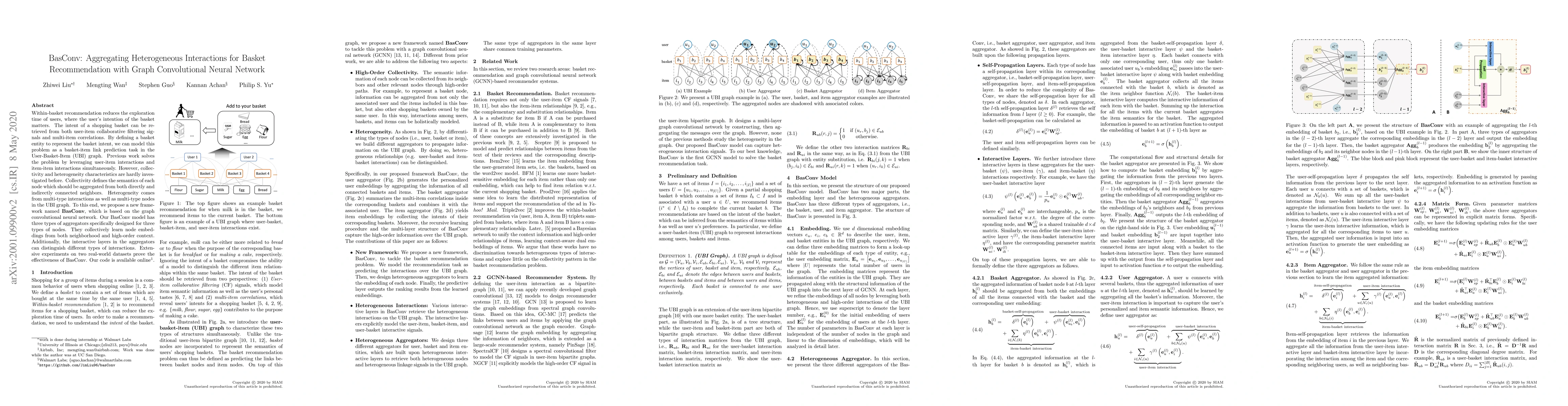 Within-basket recommendation reduces the exploration time of users, where the user's intention of the basket matters. The intent of a shopping basket can be retrieved from both user-item collaborative filtering signals and multi-item correlations. By defining a basket entity to represent the basket intent, we can model this problem as a basket-item link prediction task in the User-Basket-Item~(UBI) graph. Previous work solves the problem by leveraging user-item interactions and item-item interactions simultaneously. However, collectivity and heterogeneity characteristics are hardly investigated before. Collectivity defines the semantics of each node which should be aggregated from both directly and indirectly connected neighbors. Heterogeneity comes from multi-type interactions as well as multi-type nodes in the UBI graph. To this end, we propose a new framework named \textbf{BasConv}, which is based on the graph convolutional neural network. Our BasConv model has three types of aggregators specifically designed for three types of nodes. They collectively learn node embeddings from both neighborhood and high-order context. Additionally, the interactive layers in the aggregators can distinguish different types of interactions. Extensive experiments on two real-world datasets prove the effectiveness of BasConv. Our code is available online at https://github.com/JimLiu96/basConv.