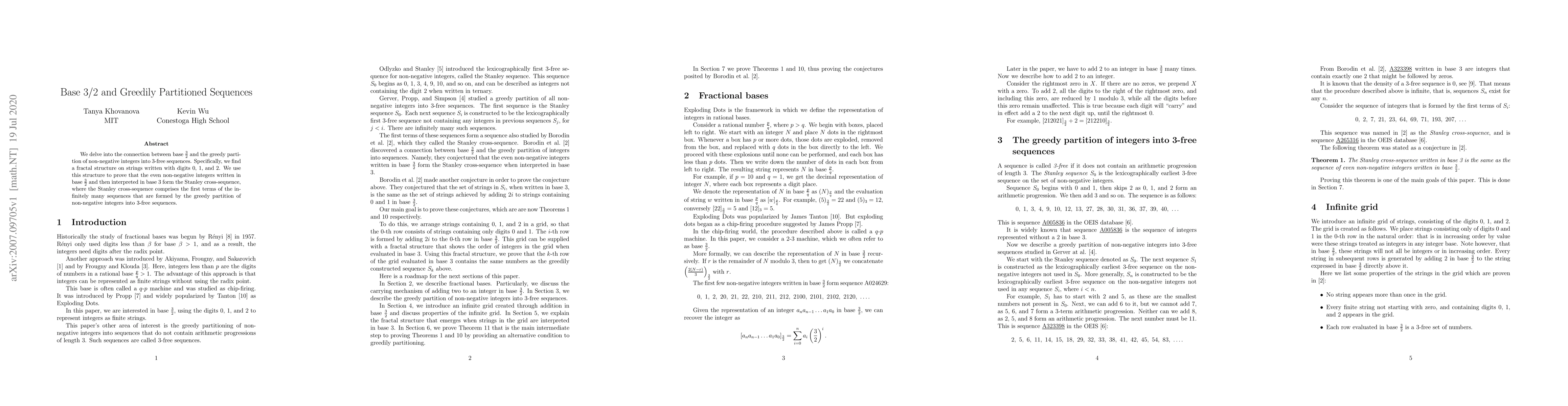 This paper explores the relationship between base $\frac{3}{2}$ and the greedy partition of non-negative integers into 3-free sequences, revealing a fractal structure in strings of 0, 1, and 2. It demonstrates that even non-negative integers in base $\frac{3}{2}$ interpreted in base 3 form the Stanley cross-sequence.