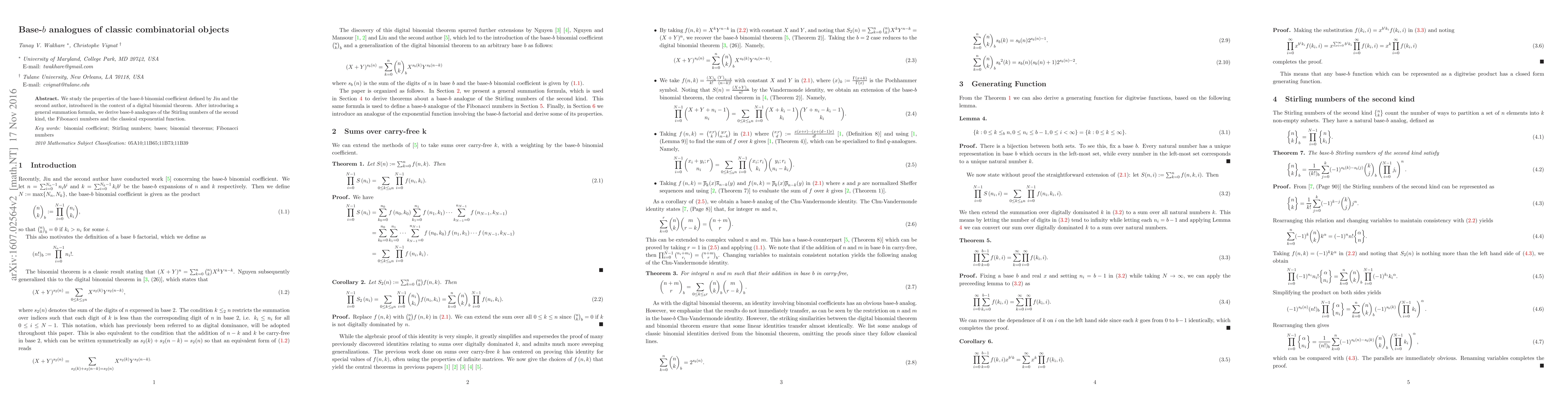 Researchers developed base-$b$ analogues of classic combinatorial objects like Stirling numbers, Fibonacci numbers, and the exponential function, using a general summation formula.