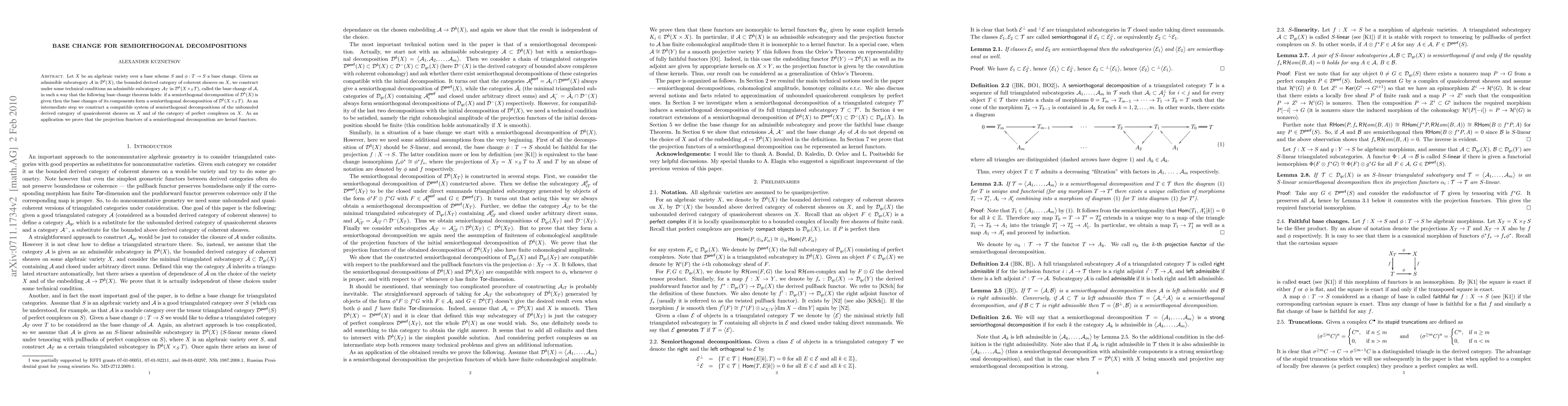Consider an algebraic variety $X$ over a base scheme $S$ and a faithful base change $T \to S$. Given an admissible subcategory $\CA$ in the bounded derived category of coherent sheaves on $X$, we construct an admissible subcategory in the bounded derived category of coherent sheaves on the fiber product $X\times_S T$, called the base change of $\CA$, in such a way that the following base change theorem holds: if a semiorthogonal decomposition of the bounded derived category of $X$ is given then the base changes of its components form a semiorthogonal decomposition of the bounded derived category of the fiber product. As an intermediate step we construct a compatible system of semiorthogonal decompositions of the unbounded derived category of quasicoherent sheaves on $X$ and of the category of perfect complexes on $X$. As an application we prove that the projection functors of a semiorthogonal decomposition are kernel functors.