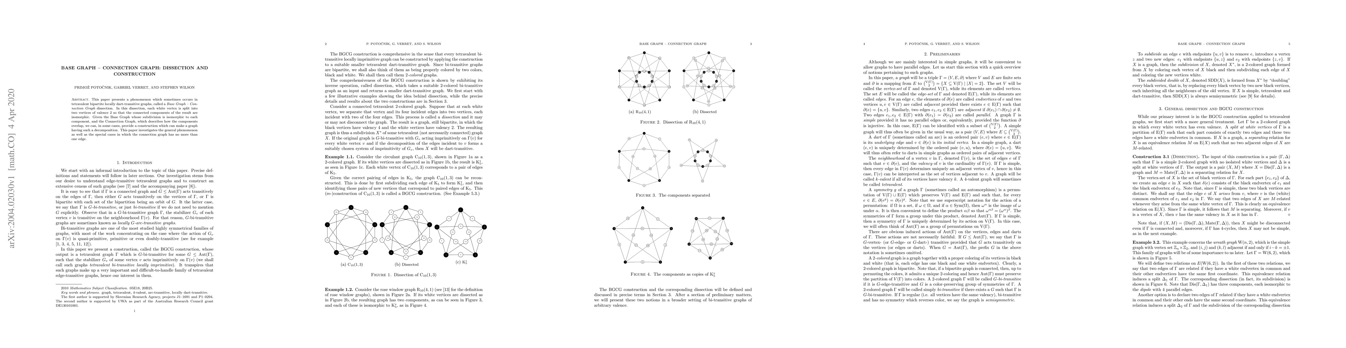 This paper presents a phenomenon which sometimes occurs in tetravalent bipartite locally dart-transitive graphs, called a Base Graph -- Connection Graph dissection. In this dissection, each white vertex is split into two vertices of valence 2 so that the connected components of the result are isomorphic. Given the Base Graph whose subdivision is isomorphic to each component, and the Connection Graph, which describes how the components overlap, we can, in some cases, provide a construction which can make a graph having such a decomposition. This paper investigates the general phenomenon as well as the special cases in which the connection graph has no more than one edge.