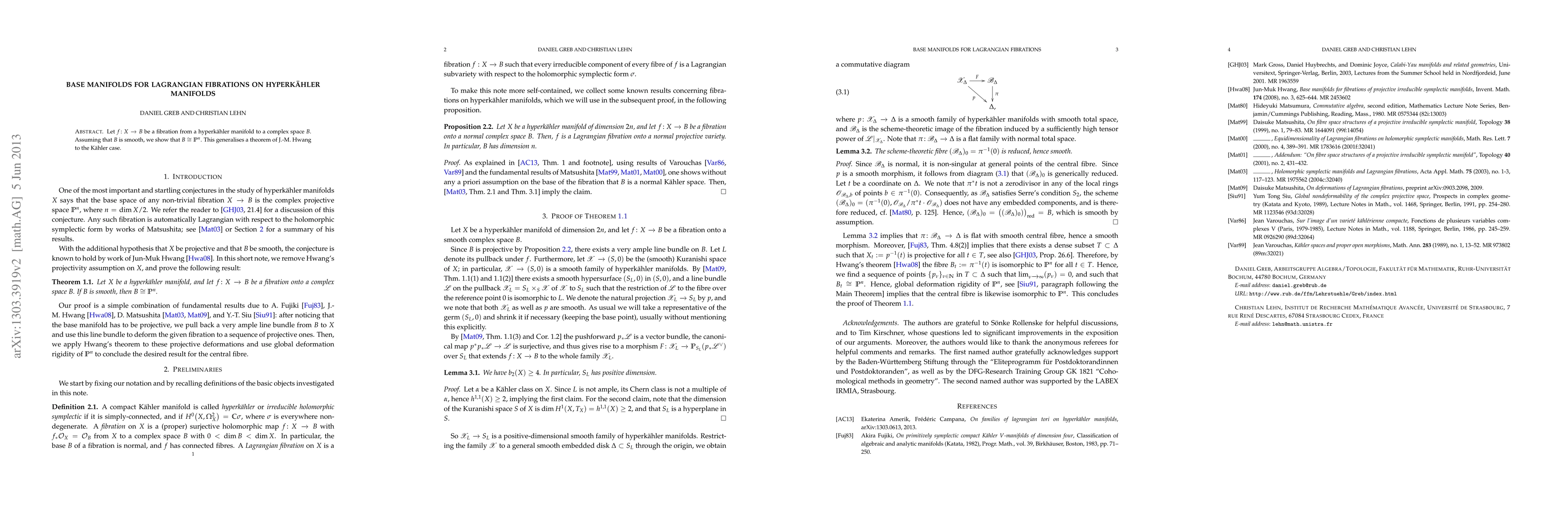 Summary: The paper demonstrates that the base manifold of a Lagrangian fibration on hyperkähler manifolds is isomorphic to complex projective space, generalizing a prior result by J.-M. Hwang for the Kähler case.