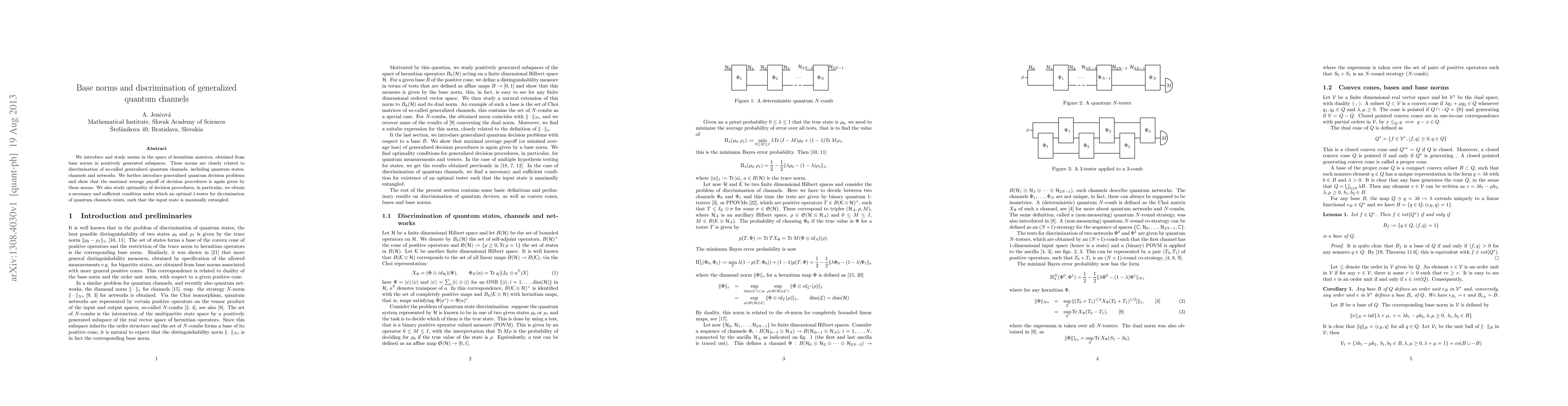 We introduce and study norms in the space of hermitian operators, obtained from base norms in positively generated subspaces. These norms are closely related to discrimination of so-called generalized quantum channels, including quantum states, channels and networks. We further introduce generalized quantum decision problems and show that the maximal average payoff of decision procedures is again given by these norms. We also study optimality of decision procedures, in particular, we obtain a necessary and sufficient condition under which an optimal 1-tester for discrimination of quantum channels exists, such that the input state is maximally entangled.