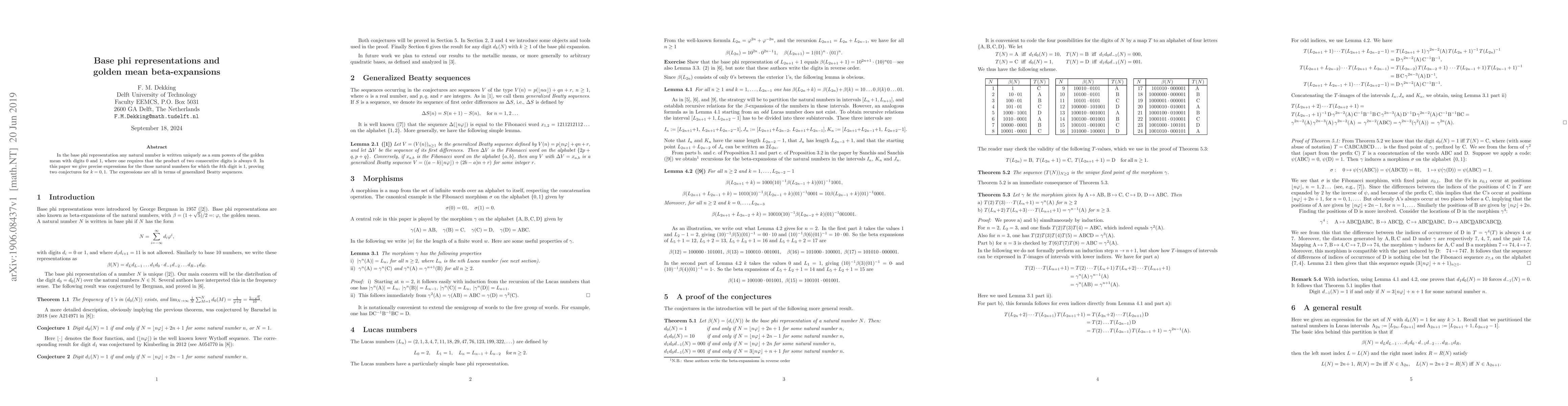 The paper explores base phi representations of natural numbers, where numbers are expressed uniquely as sums of powers of the golden mean with digits 0 and 1, proving conjectures for the $k$th digit being 1 and relating these expressions to generalized Beatty sequences.