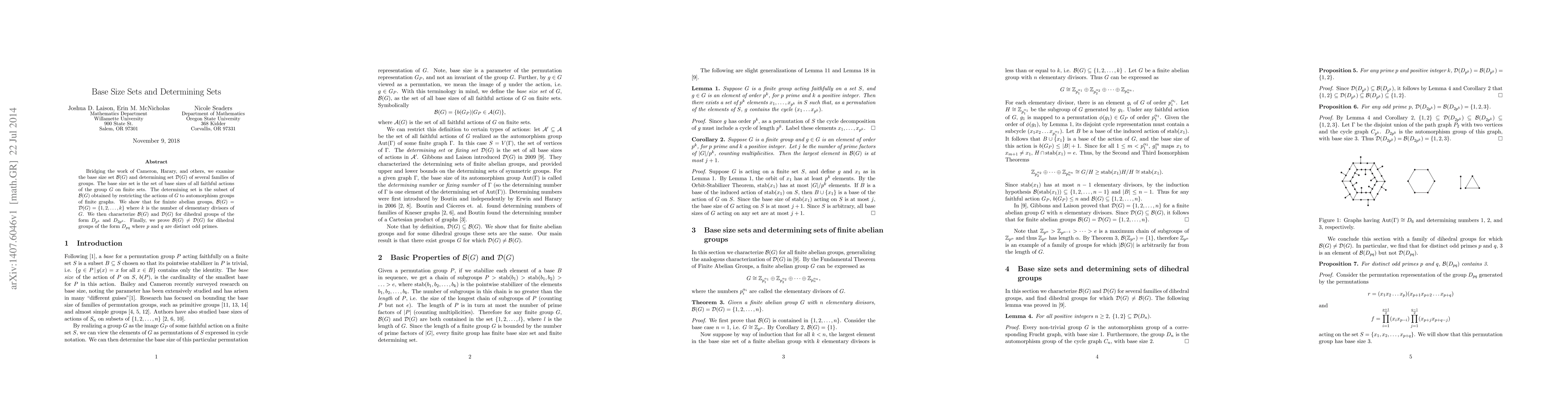 Researchers studied base size sets and determining sets of various groups, finding that for finite abelian groups, the two sets coincide at {1, 2, ..., k}, where k is the number of elementary divisors of G. This contrasts with non-abelian dihedral groups, which have distinct B(G) and D(G) sets.