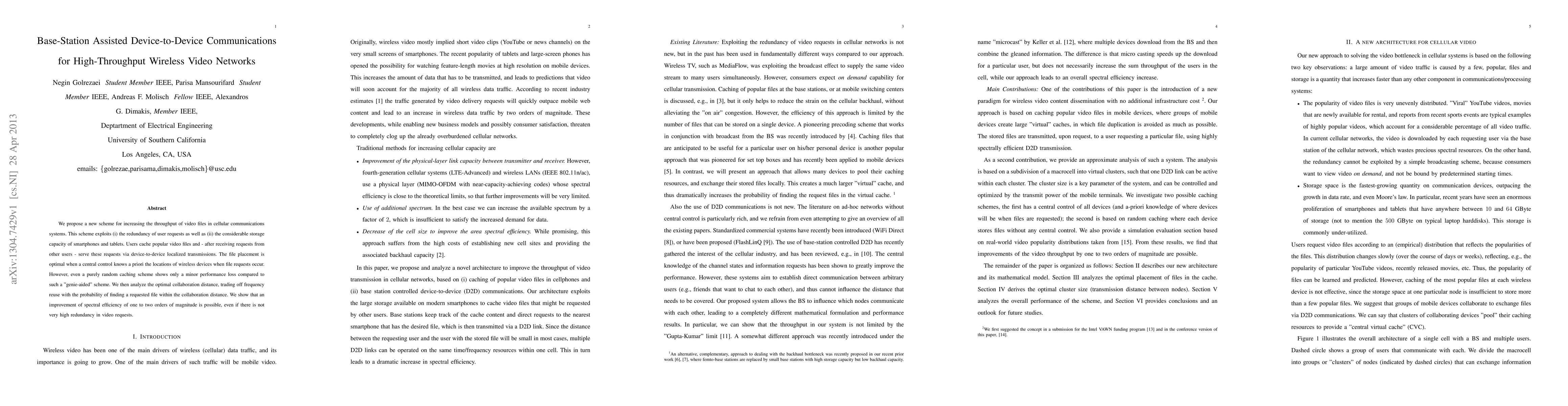 This paper proposes a scheme for enhancing video throughput in cellular networks by leveraging base-station assisted device-to-device communications. It uses smartphone caching of popular videos and localized transmissions to meet user requests, achieving significant spectral efficiency improvements even with random caching.