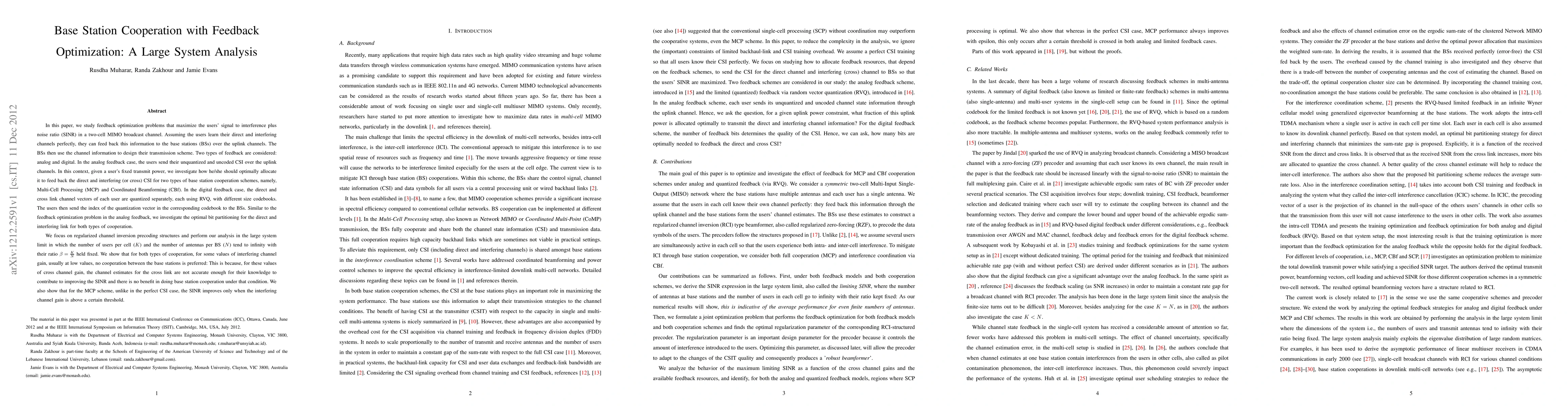 In this paper, we study feedback optimization problems that maximize the users' signal to interference plus noise ratio (SINR) in a two-cell MIMO broadcast channel. Assuming the users learn their direct and interfering channels perfectly, they can feed back this information to the base stations (BSs) over the uplink channels. The BSs then use the channel information to design their transmission scheme. Two types of feedback are considered: analog and digital. In the analog feedback case, the users send their unquantized and uncoded CSI over the uplink channels. In this context, given a user's fixed transmit power, we investigate how he/she should optimally allocate it to feed back the direct and interfering (or cross) CSI for two types of base station cooperation schemes, namely, Multi-Cell Processing (MCP) and Coordinated Beamforming (CBf). In the digital feedback case, the direct and cross link channel vectors of each user are quantized separately, each using RVQ, with different size codebooks. The users then send the index of the quantization vector in the corresponding codebook to the BSs. Similar to the feedback optimization problem in the analog feedback, we investigate the optimal bit partitioning for the direct and interfering link for both types of cooperation. We focus on regularized channel inversion precoding structures and perform our analysis in the large system limit in which the number of users per cell ($K$) and the number of antennas per BS ($N$) tend to infinity with their ratio $\beta=\frac{K}{N}$ held fixed.