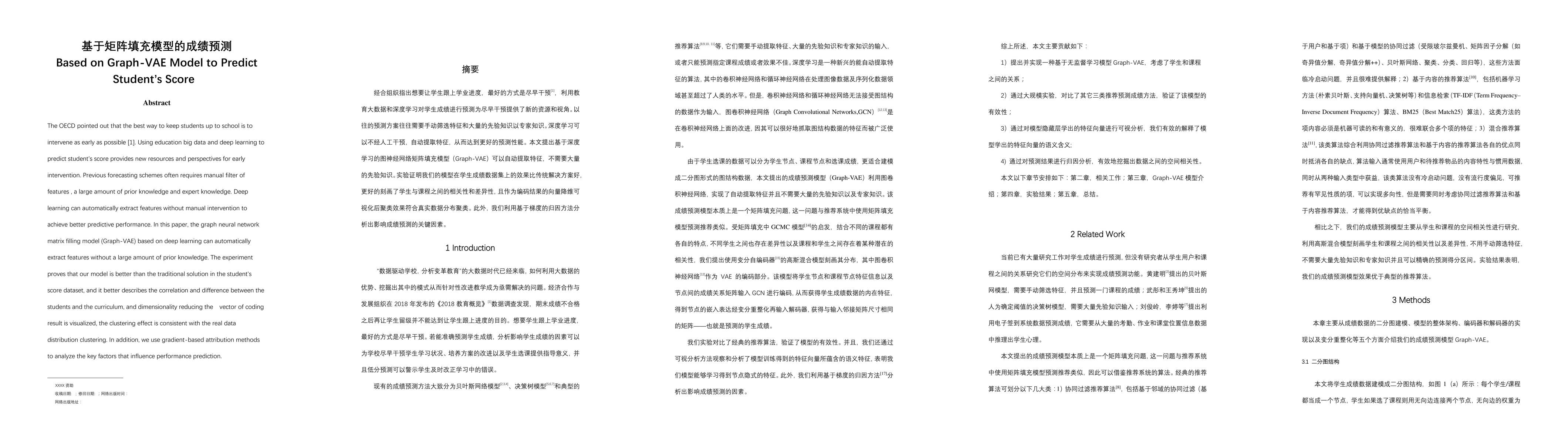 The OECD pointed out that the best way to keep students up to school is to intervene as early as possible [1]. Using education big data and deep learning to predict student's score provides new resources and perspectives for early intervention. Previous forecasting schemes often requires manual filter of features , a large amount of prior knowledge and expert knowledge. Deep learning can automatically extract features without manual intervention to achieve better predictive performance. In this paper, the graph neural network matrix filling model (Graph-VAE) based on deep learning can automatically extract features without a large amount of prior knowledge. The experiment proves that our model is better than the traditional solution in the student's score dataset, and it better describes the correlation and difference between the students and the curriculum, and dimensionality reducing the vector of coding result is visualized, the clustering effect is consistent with the real data distribution clustering. In addition, we use gradient-based attribution methods to analyze the key factors that influence performance prediction.