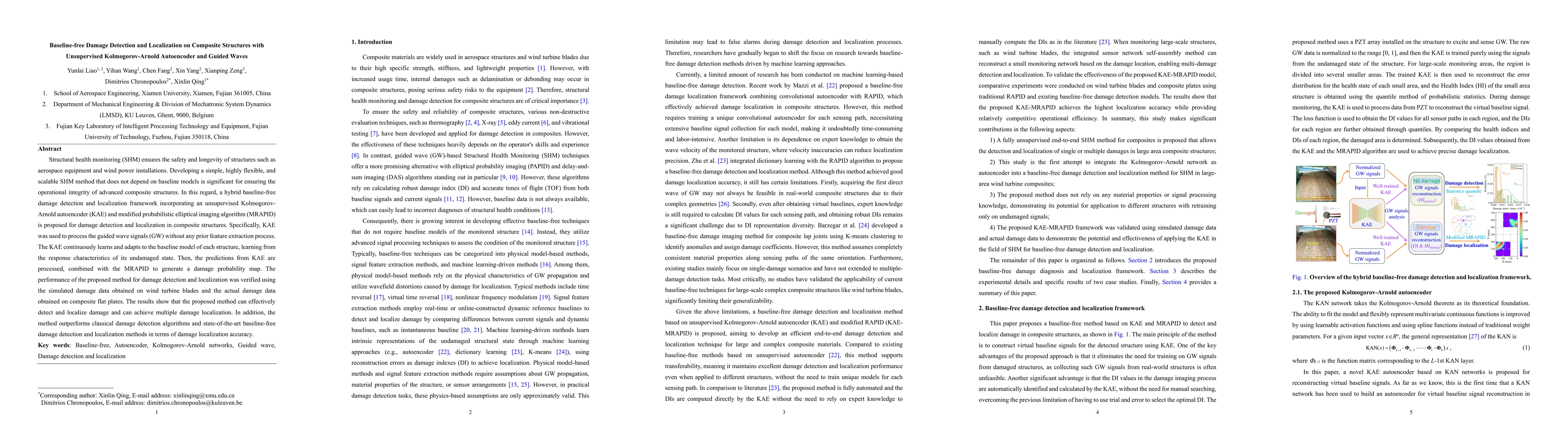 Structural health monitoring (SHM) ensures the safety and longevity of structures such as aerospace equipment and wind power installations. Developing a simple, highly flexible, and scalable SHM method that does not depend on baseline models is significant for ensuring the operational integrity of advanced composite structures. In this regard, a hybrid baseline-free damage detection and localization framework incorporating an unsupervised Kolmogorov-Arnold autoencoder (KAE) and modified probabilistic elliptical imaging algorithm (MRAPID) is proposed for damage detection and localization in composite structures. Specifically, KAE was used to process the guided wave signals (GW) without any prior feature extraction process. The KAE continuously learns and adapts to the baseline model of each structure, learning from the response characteristics of its undamaged state. Then, the predictions from KAE are processed, combined with the MRAPID to generate a damage probability map. The performance of the proposed method for damage detection and localization was verified using the simulated damage data obtained on wind turbine blades and the actual damage data obtained on composite flat plates. The results show that the proposed method can effectively detect and localize damage and can achieve multiple damage localization. In addition, the method outperforms classical damage detection algorithms and state-of-the-art baseline-free damage detection and localization methods in terms of damage localization accuracy.