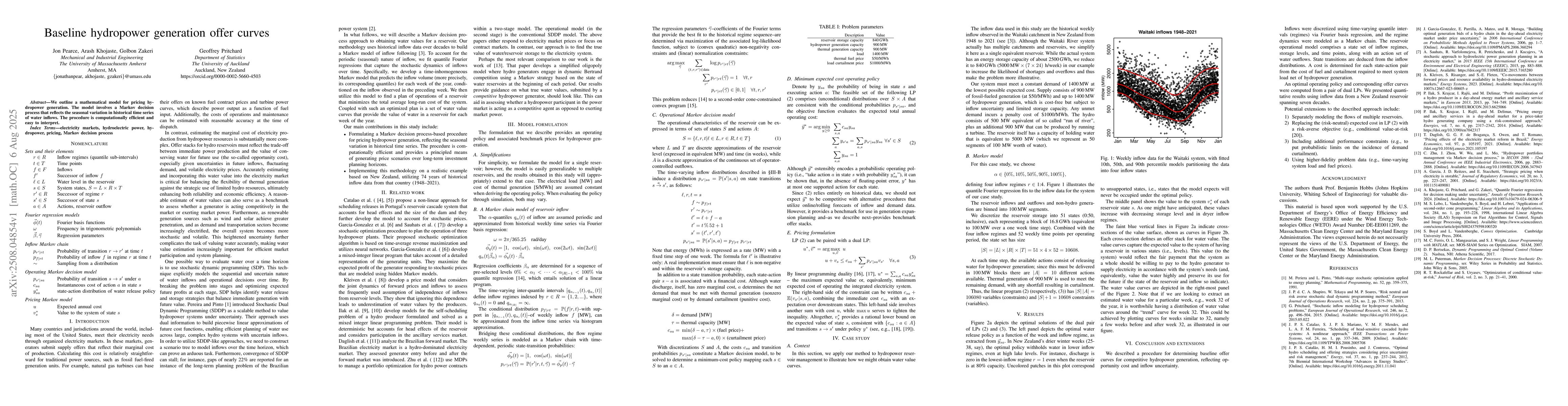 We outline a mathematical model for pricing hydropower generation. The model involves a Markov decision process that reflects the seasonal variation in historical time series of water inflows. The procedure is computationally efficient and easy to interpret.