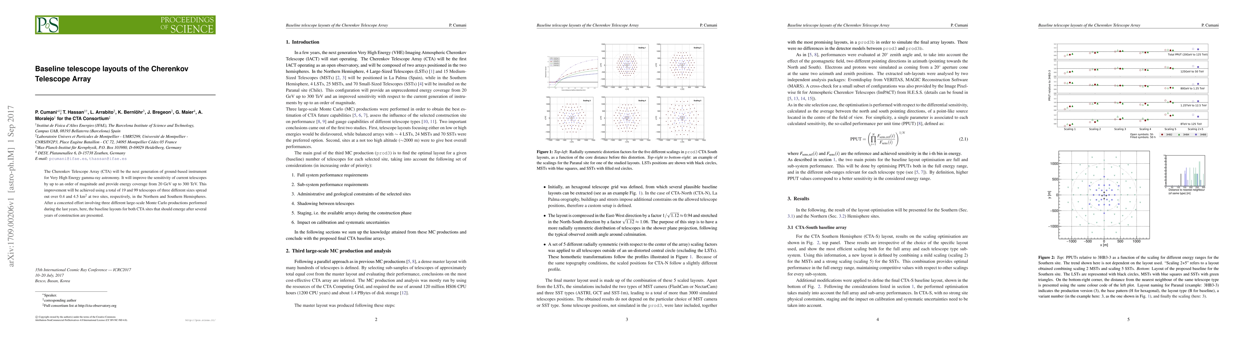 The Cherenkov Telescope Array (CTA) will be the next generation of ground-based instrument for Very High Energy gamma-ray astronomy. It will improve the sensitivity of current telescopes by up to an order of magnitude and provide energy coverage from 20 GeV up to 300 TeV. This improvement will be achieved using a total of 19 and 99 telescopes of three different sizes spread out over 0.4 and 4.5 km$^2$ at two sites, respectively, in the Northern and Southern Hemispheres. After a concerted effort involving three different large-scale Monte Carlo productions performed during the last years, here, the baseline layouts for both CTA sites that should emerge after several years of construction are presented.