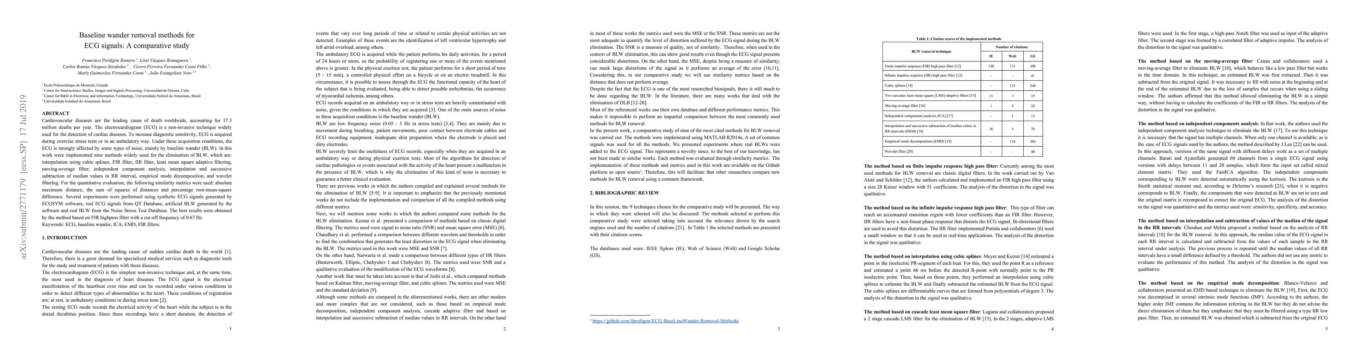 Cardiovascular diseases are the leading cause of death worldwide, accounting for 17.3 million deaths per year. The electrocardiogram (ECG) is a non-invasive technique widely used for the detection of cardiac diseases. To increase diagnostic sensitivity, ECG is acquired during exercise stress tests or in an ambulatory way. Under these acquisition conditions, the ECG is strongly affected by some types of noise, mainly by baseline wander (BLW). In this work were implemented nine methods widely used for the elimination of BLW, which are: interpolation using cubic splines, FIR filter, IIR filter, least mean square adaptive filtering, moving-average filter, independent component analysis, interpolation and successive subtraction of median values in RR interval, empirical mode decomposition and wavelet filtering. For the quantitative evaluation, the following similarity metrics were used: absolute maximum distance, the sum of squares of distances and percentage root-mean-square difference. Several experiments were performed using synthetic ECG signals generated by ECGSYM software, real ECG signals from QT Database, artificial BLW generated by software and real BLW from the Noise Stress Test Database. The best results were obtained by the method based on FIR high-pass filter with a cut-off frequency of 0.67 Hz.