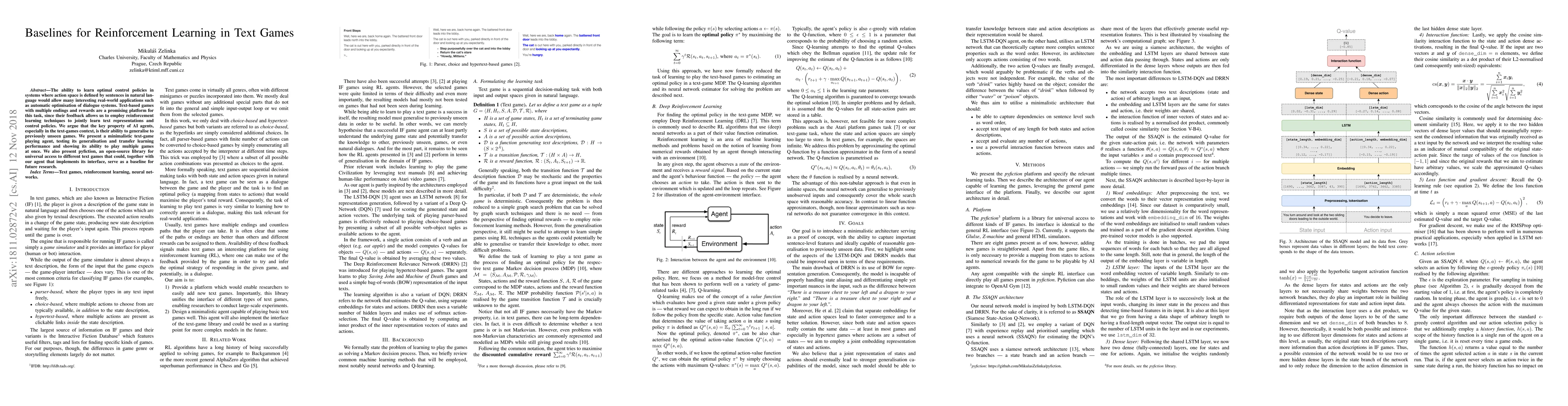 This paper introduces a minimalistic text-game playing agent designed to learn optimal control policies through reinforcement learning, emphasizing its ability to generalize to new games. It also presents pyfiction, an open-source library for accessing various text games, serving as a baseline for future research in this domain.