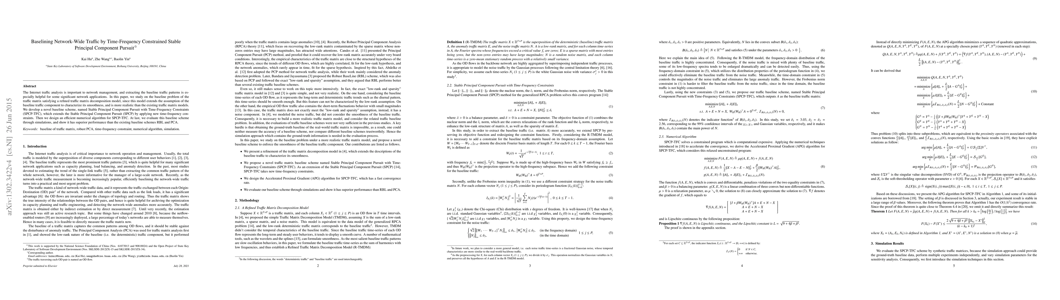 This paper proposes a novel method, SPCP-TFC, for extracting baseline traffic patterns from network traffic matrices by incorporating time-frequency constraints. The method outperforms existing baseline schemes, RBL and PCA, based on simulation results.