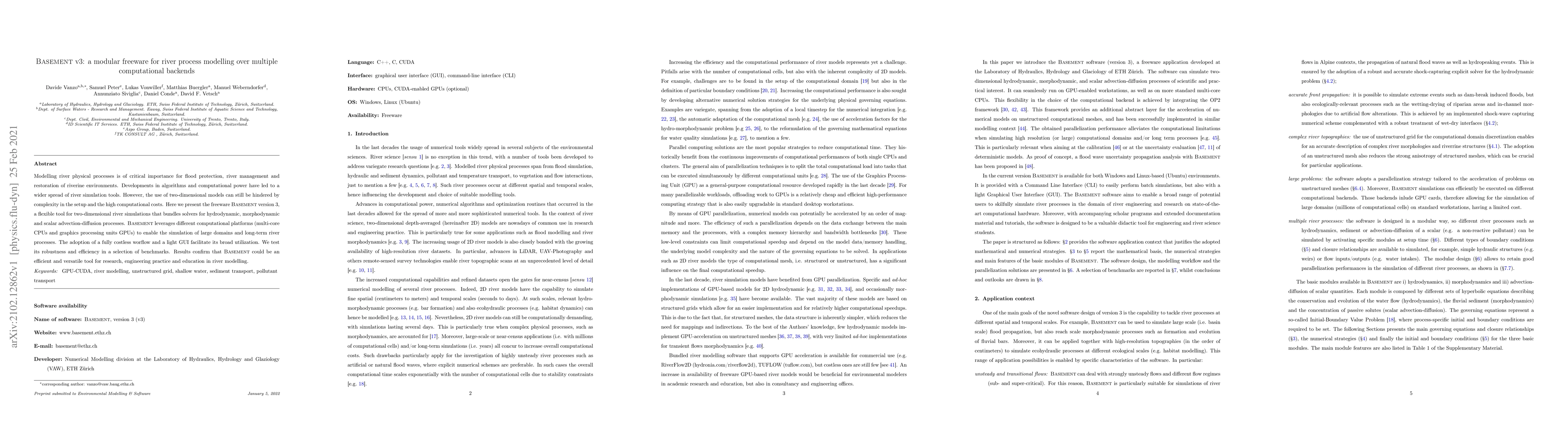 Modelling river physical processes is of critical importance for flood protection, river management and restoration of riverine environments. Developments in algorithms and computational power have led to a wider spread of river simulation tools. However, the use of two-dimensional models can still be hindered by complexity in the setup and the high computational costs. Here we present the freeware BASEMENT version 3, a flexible tool for two-dimensional river simulations that bundles solvers for hydrodynamic, morphodynamic and scalar advection-diffusion processes. BASEMENT leverages different computational platforms (multi-core CPUs and graphics processing units GPUs) to enable the simulation of large domains and long-term river processes. The adoption of a fully costless worflow and a light GUI facilitate its broad utilization. We test its robustness and efficiency in a selection of benchmarks. Results confirm that BASEMENT could be an efficient and versatile tool for research, engineering practice and education in river modelling.
