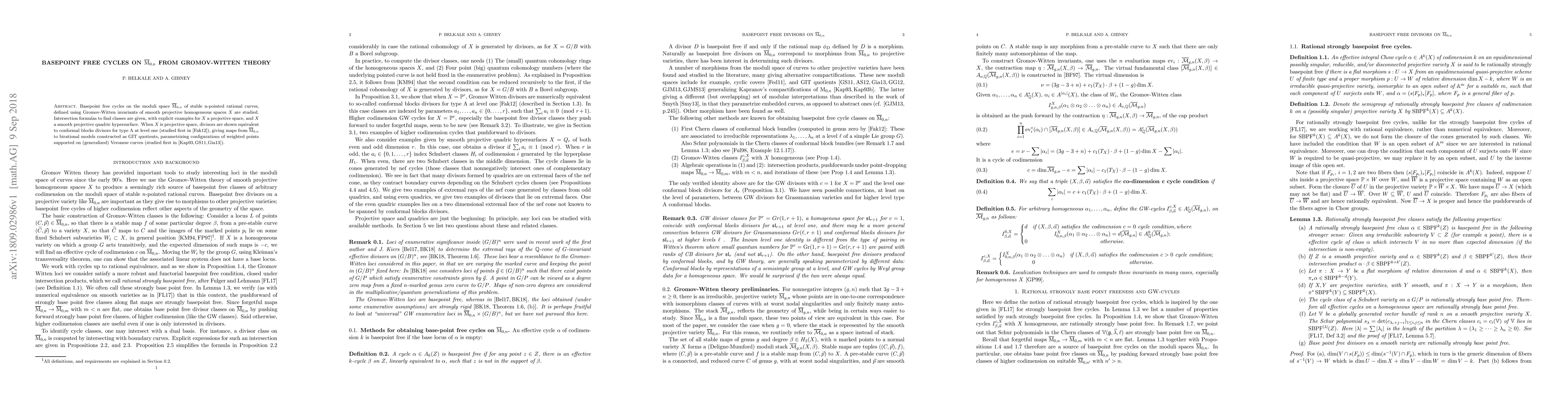 This paper investigates basepoint free cycles on the moduli space $\overline{M}_{0,n}$ via Gromov-Witten invariants of smooth projective homogeneous spaces, providing intersection formulas and explicit examples for projective spaces and quadric hypersurfaces. It shows equivalence to conformal blocks for type A level one when X is projective space, linking $\overline{M}_{0,n}$ to birational models parametrizing weighted point configurations on Veronese curves.