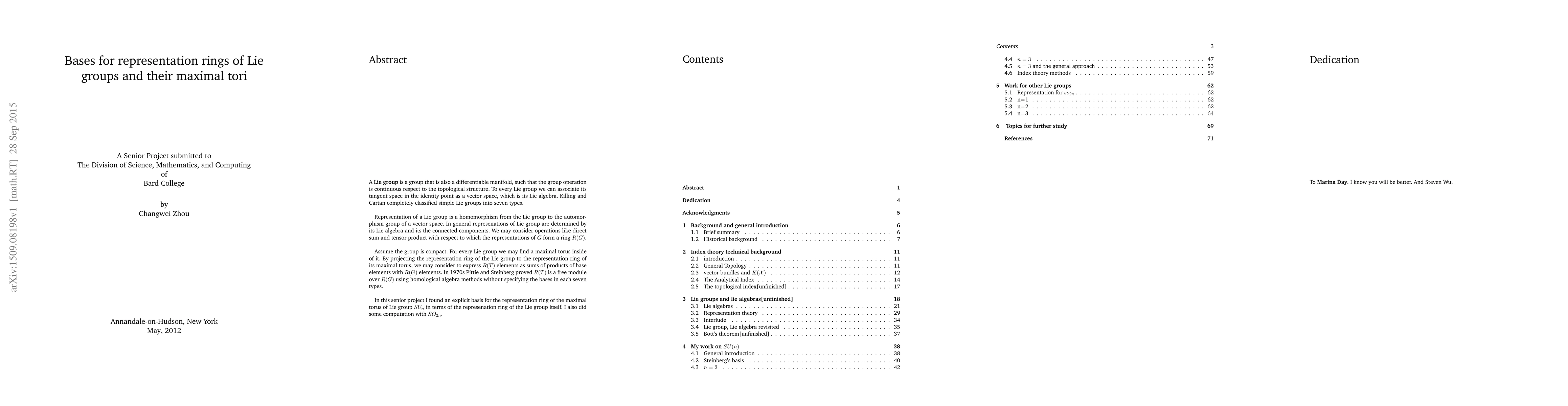 A Lie group is a group that is also a differentiable manifold, such that the group operation is continuous respect to the topological structure. To every Lie group we can associate its tangent space in the identity point as a vector space, which is its Lie algebra. Killing and Cartan completely classified simple Lie groups into seven types. Representation of a Lie group is a homomorphism from the Lie group to the automorphism group of a vector space. In general represenations of Lie group are determined by its Lie algebra and its the connected components. We may consider operations like direct sum and tensor product with respect to which the representations of G form a ring R(G). Assume the group is compact. For every Lie group we may find a maximal torus inside of it. By projecting the representation ring of the Lie group to the representation ring of its maximal torus, we may consider to express R(T) elements as sums of products of base elements with R(G) elements. In 1970s Pittie and Steinberg proved R(T) is a free module over R(G) using homological algebra methods without specifying the bases in each seven types. In this senior project I found an explicit basis for the representation ring of the maximal torus of Lie group SUn in terms of the represenation ring of the Lie group itself. I also did some computation with SO2n.
