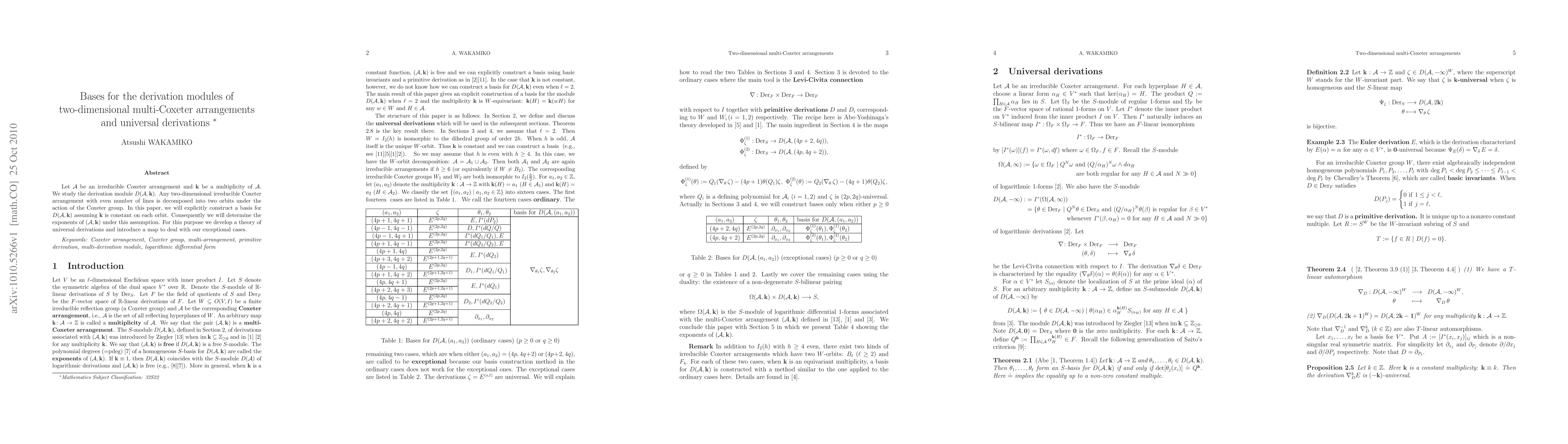 This paper constructs a basis for the derivation module of two-dimensional irreducible Coxeter arrangements with an even number of lines, decomposing them into two orbits. It develops a theory of universal derivations and introduces a specific map to address exceptional cases, thereby determining the exponents of these arrangements under the assumption of constant multiplicity.