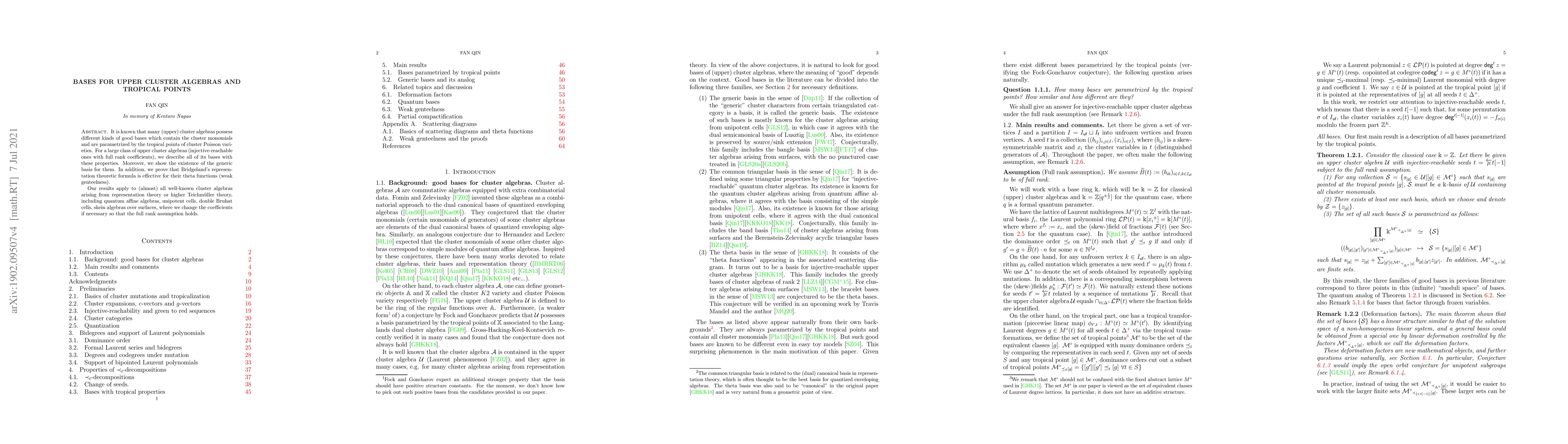 It is known that many (upper) cluster algebras possess different kinds of good bases which contain the cluster monomials and are parametrized by the tropical points of cluster Poisson varieties. For a large class of upper cluster algebras (injective-reachable ones with full rank coefficients), we describe all of its bases with these properties. Moreover, we show the existence of the generic basis for them. In addition, we prove that Bridgeland's representation theoretic formula is effective for their theta functions (weak genteelness). Our results apply to (almost) all well-known cluster algebras arising from representation theory or higher Teichm\"uller theory, including quantum affine algebras, unipotent cells, double Bruhat cells, skein algebras over surfaces, where we change the coefficients if necessary so that the full rank assumption holds.