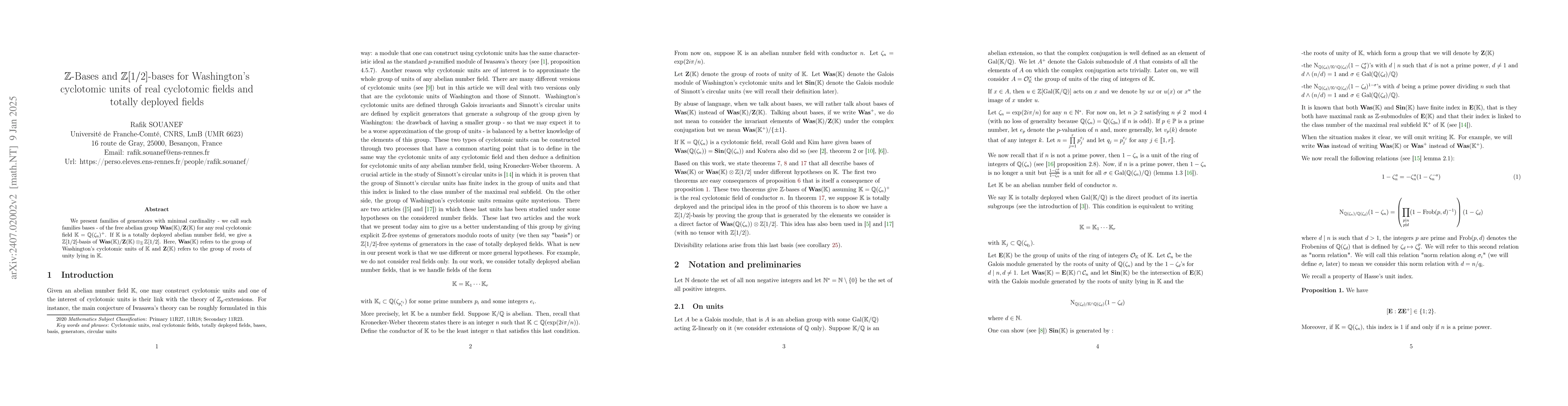 This paper identifies minimal generating sets, termed bases, for the free abelian group of Washington's cyclotomic units in real cyclotomic fields $\mathbb{Q}(\zeta_n)^{+}$ and totally deployed abelian number fields. The focus is on the quotient group Was$(\mathbb{K}) / \mathbf{Z}(\mathbb{K})$.
