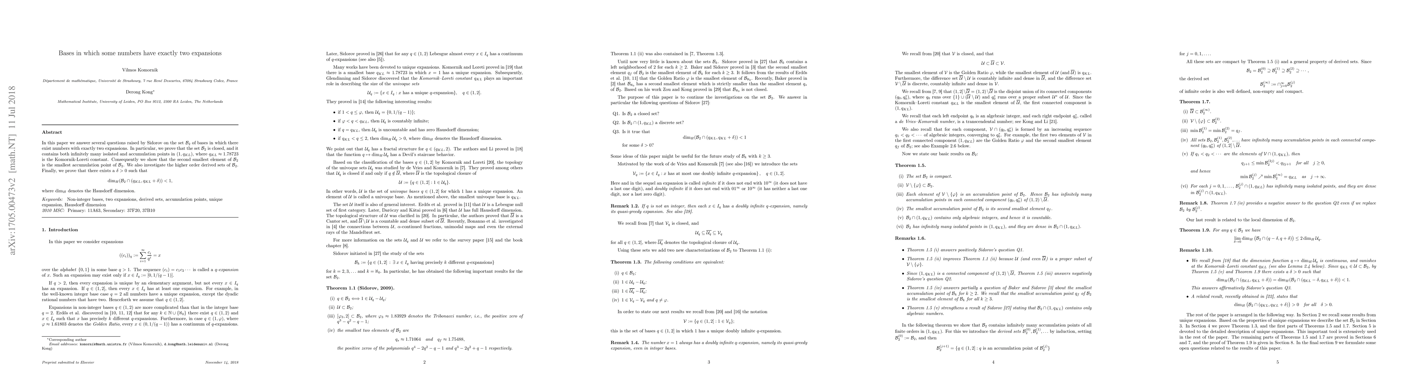 This paper proves that the set of bases with numbers having exactly two expansions, denoted as $mathcal B_2$, is closed with both isolated and accumulation points in $(1, q_{KL})$. It also shows that the second smallest element of $mathcal B_2$ is the smallest accumulation point, and explores higher order derived sets of $mathcal B_2$. Furthermore, it establishes the existence of a $delta>0$ such that the Hausdorff dimension of $mathcal B_2cap(q_{KL}, q_{KL}+delta)$ is less than 1.