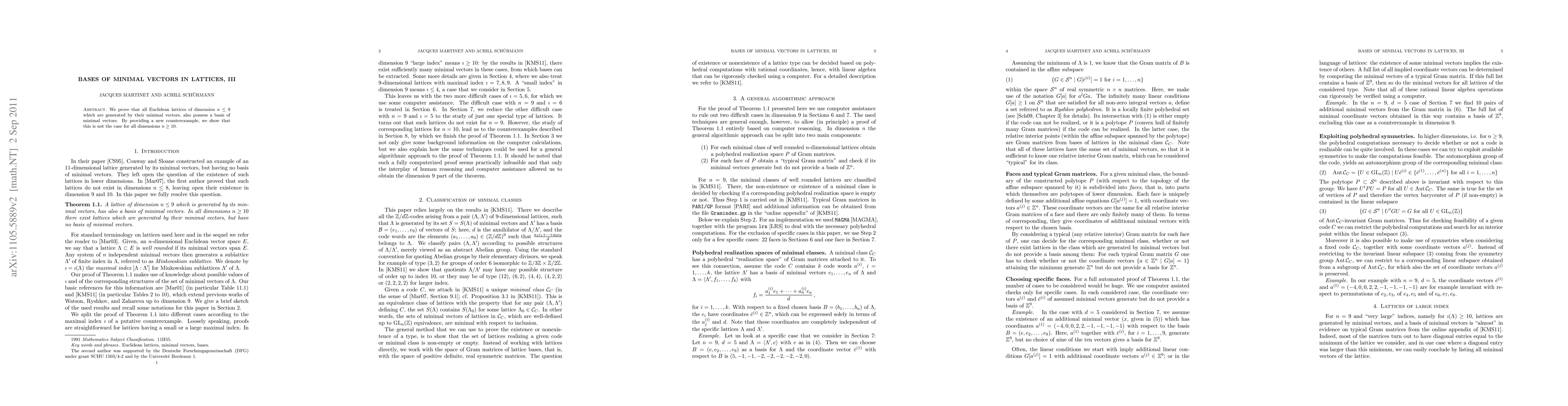 Researchers prove that Euclidean lattices of dimension 9 or less generated by minimal vectors also have a basis of minimal vectors. However, they find no such basis for dimensions 10 or more.
