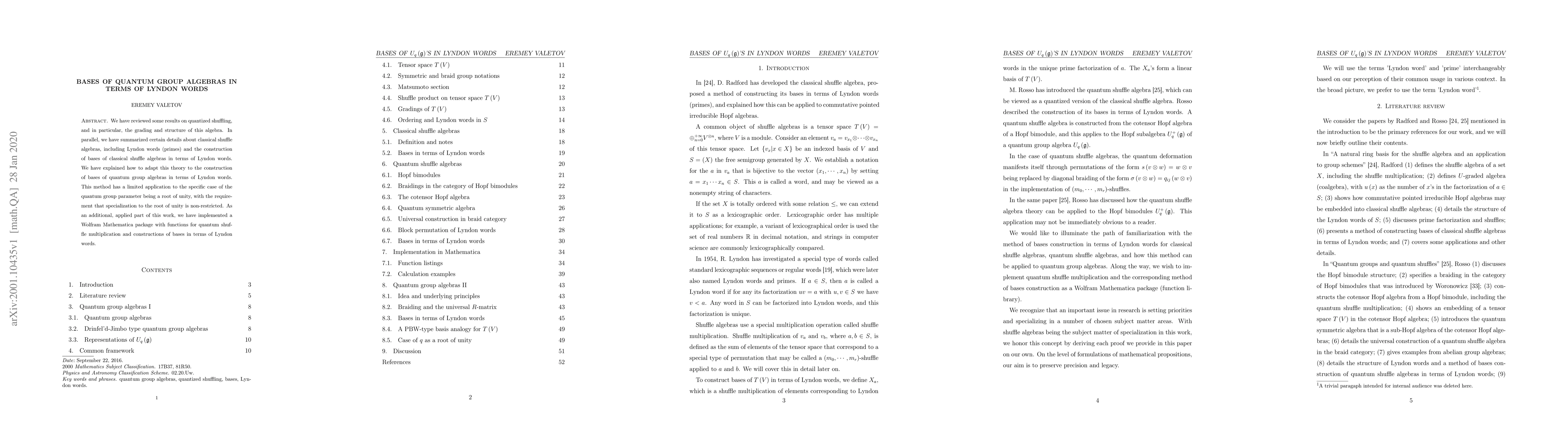 We have reviewed some results on quantized shuffling, and in particular, the grading and structure of this algebra. In parallel, we have summarized certain details about classical shuffle algebras, including Lyndon words (primes) and the construction of bases of classical shuffle algebras in terms of Lyndon words. We have explained how to adapt this theory to the construction of bases of quantum group algebras in terms of Lyndon words. This method has a limited application to the specific case of the quantum group parameter being a root of unity, with the requirement that specialization to the root of unity is non-restricted. As an additional, applied part of this work, we have implemented a Wolfram Mathematica package with functions for quantum shuffle multiplication and constructions of bases in terms of Lyndon words.