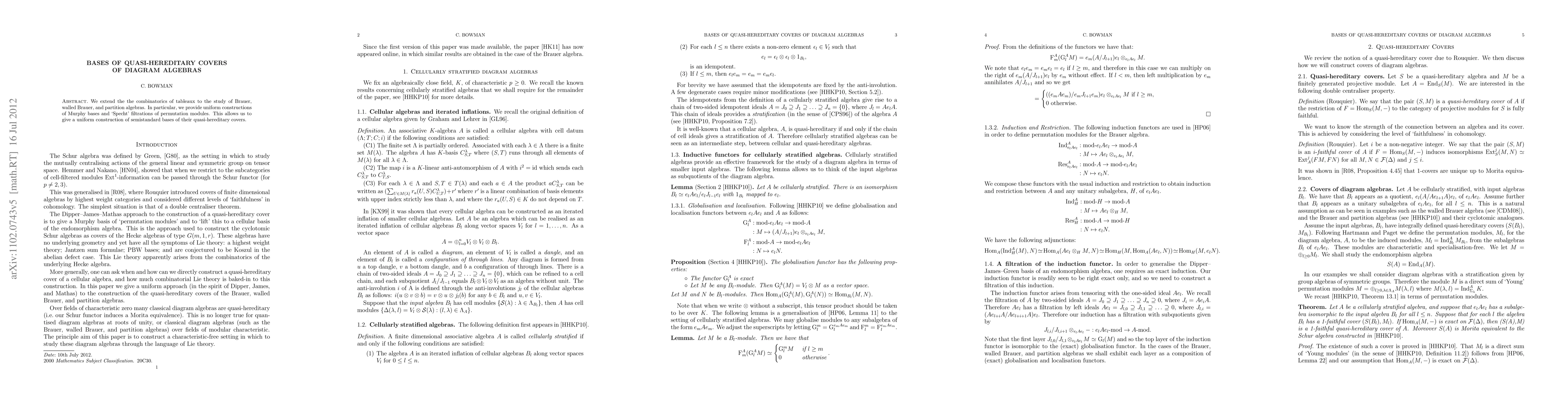 We extend the the combinatorics of tableaux to the study of diagram algebras and give a uniform construction of their quasi-hereditary covers.