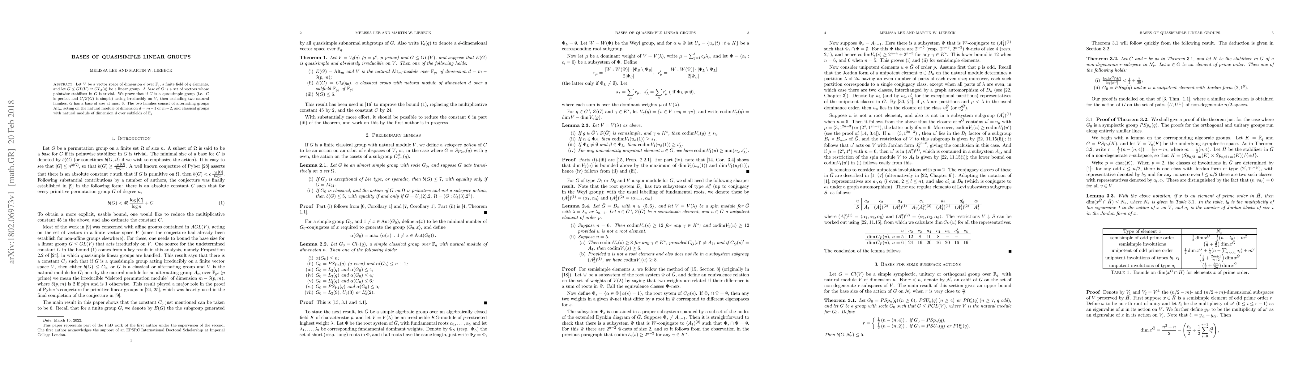 This paper establishes that quasisimple linear groups acting irreducibly on vector spaces over finite fields generally have bases of size at most 6, except for two families: alternating groups and classical groups acting on their natural modules.