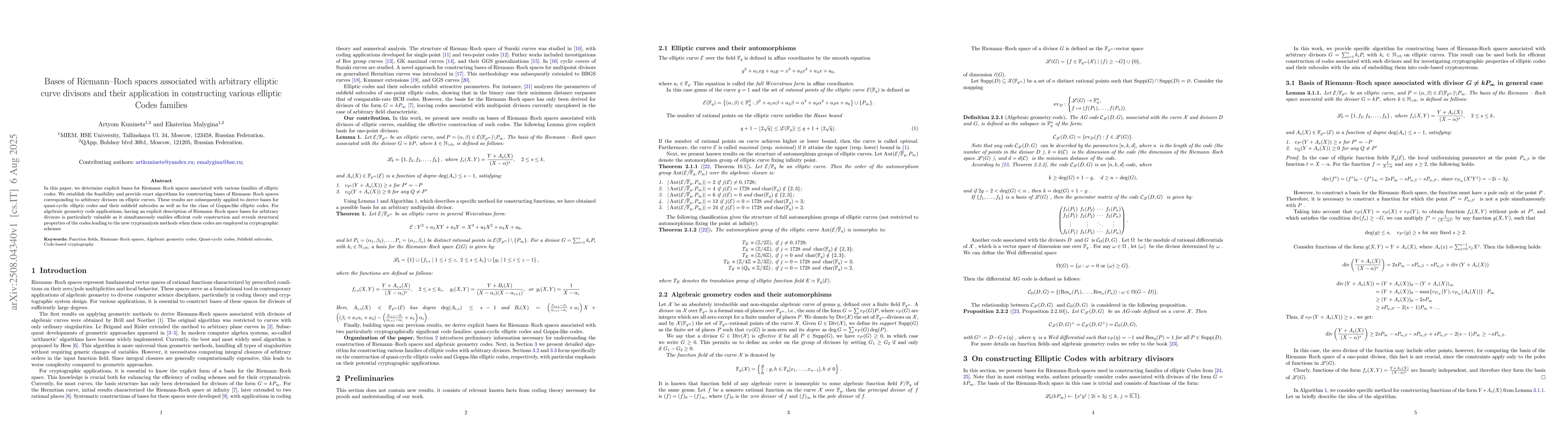 In this paper, we determine explicit bases for Riemann--Roch spaces associated with various families of elliptic codes. We establish the feasibility and provide exact algorithms for constructing bases of Riemann--Roch spaces corresponding to arbitrary divisors on elliptic curves. These results are subsequently applied to derive bases for quasi-cyclic elliptic codes and their subfield subcodes as well as for the class of Goppa-like elliptic codes. For algebraic geometry code applications, having an explicit description of Riemann--Roch space bases for arbitrary divisors is particularly valuable as it simultaneously enables efficient code construction and reveals structural properties of the codes leading to the new cryptanalysis methods when these codes are employed in cryptographic schemes