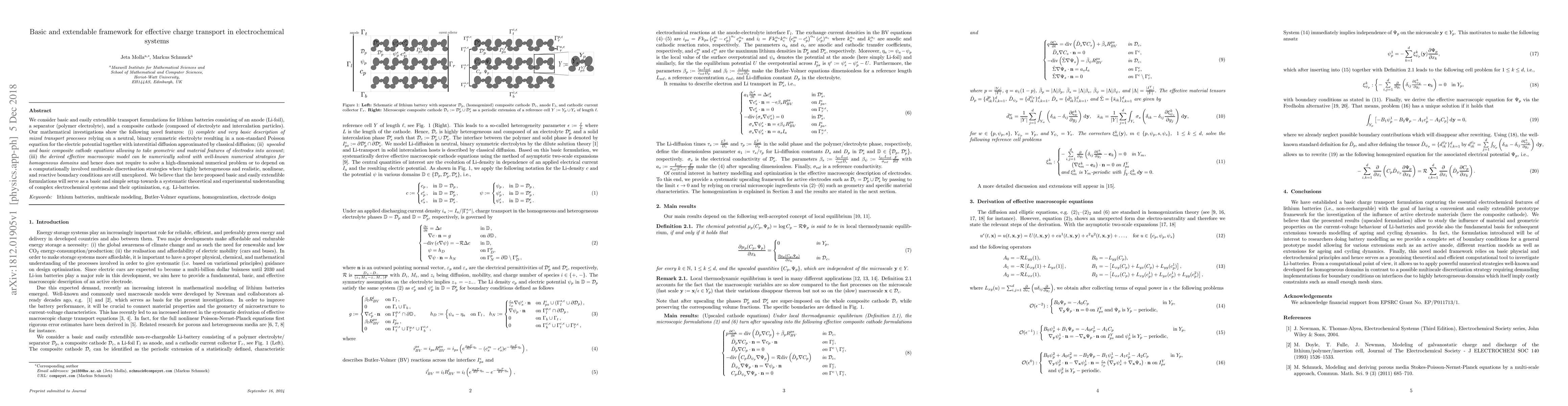 We consider basic and easily extendible transport formulations for lithium batteries consisting of an anode (Li-foil), a separator (polymer electrolyte), and a composite cathode (composed of electrolyte and intercalation particles). Our mathematical investigations show the following novel features: (i) \emph{complete and very basic description of mixed transport processes} relying on a neutral, binary symmetric electrolyte resulting in a non-standard Poisson equation for the electric potential together with interstitial diffusion approximated by classical diffusion; (ii) \emph{ upscaled and basic composite cathode equations allowing to take geometric and material features of electrodes into account}; (iii) \emph{the derived effective macroscopic model can be numerically solved with well-known numerical strategies for homogeneous domains} and hence does not require to solve a high-dimensional numerical problem or to depend on a computationally involved multiscale discretisation strategies where highly heterogeneous and realistic, nonlinear, and reactive boundary conditions are still unexplored. We believe that the here proposed basic and easily extendible formulations will serve as a basic and simple setup towards a systematic theoretical and experimental understanding of complex electrochemical systems and their optimization, e.g. Li-batteries.