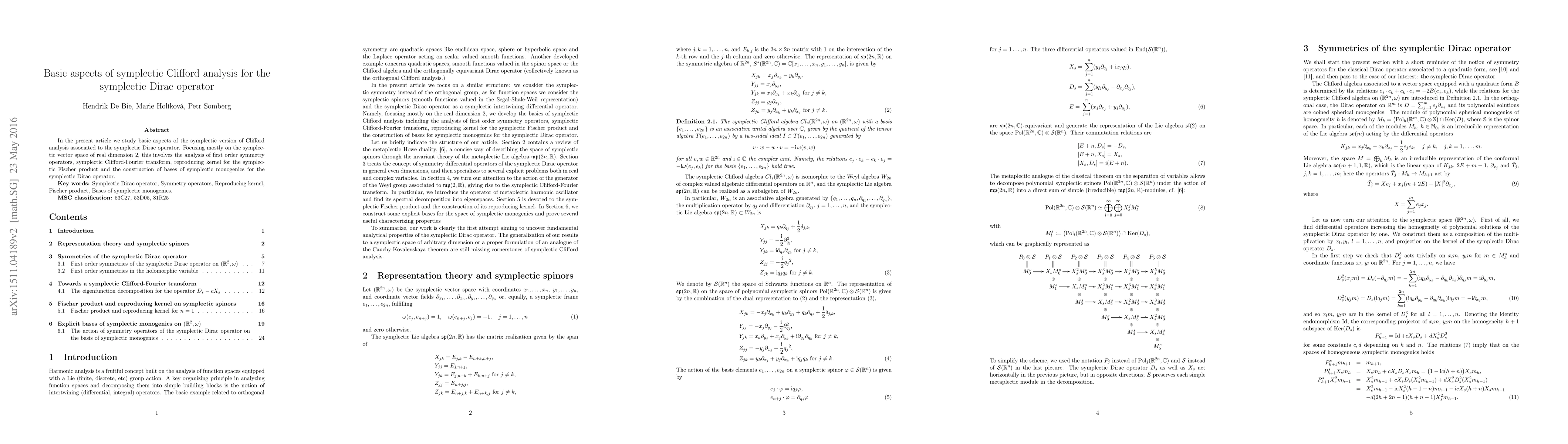 This paper explores fundamental aspects of symplectic Clifford analysis concerning the symplectic Dirac operator, focusing on a vector space of dimension 2, and examines first-order symmetry operators, the symplectic Clifford-Fourier transform, and the construction of bases for symplectic monogenic functions.