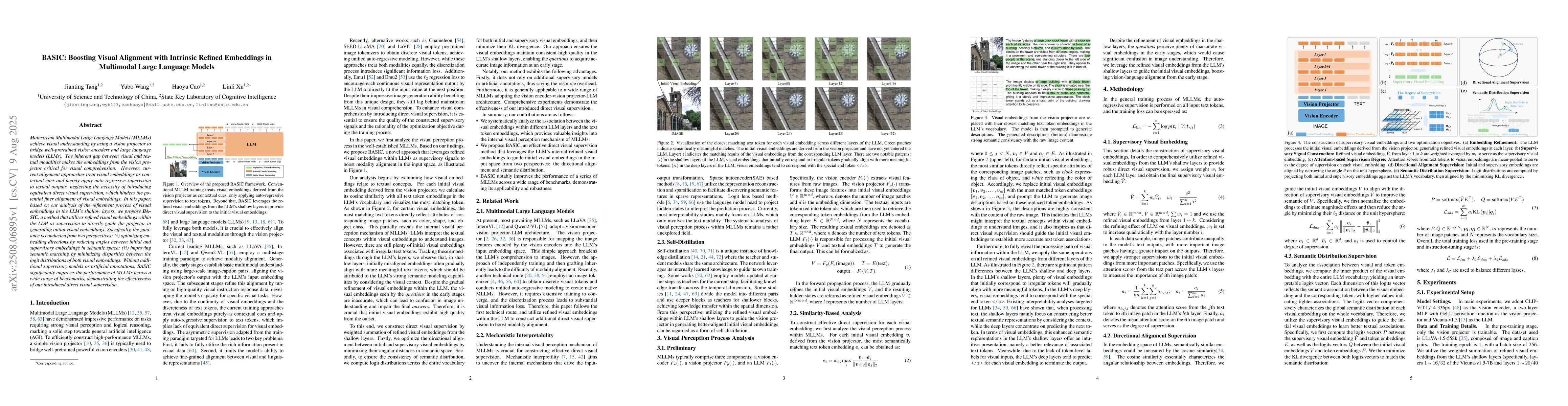 Mainstream Multimodal Large Language Models (MLLMs) achieve visual understanding by using a vision projector to bridge well-pretrained vision encoders and large language models (LLMs). The inherent gap between visual and textual modalities makes the embeddings from the vision projector critical for visual comprehension. However, current alignment approaches treat visual embeddings as contextual cues and merely apply auto-regressive supervision to textual outputs, neglecting the necessity of introducing equivalent direct visual supervision, which hinders the potential finer alignment of visual embeddings. In this paper, based on our analysis of the refinement process of visual embeddings in the LLM's shallow layers, we propose BASIC, a method that utilizes refined visual embeddings within the LLM as supervision to directly guide the projector in generating initial visual embeddings. Specifically, the guidance is conducted from two perspectives: (i) optimizing embedding directions by reducing angles between initial and supervisory embeddings in semantic space; (ii) improving semantic matching by minimizing disparities between the logit distributions of both visual embeddings. Without additional supervisory models or artificial annotations, BASIC significantly improves the performance of MLLMs across a wide range of benchmarks, demonstrating the effectiveness of our introduced direct visual supervision.