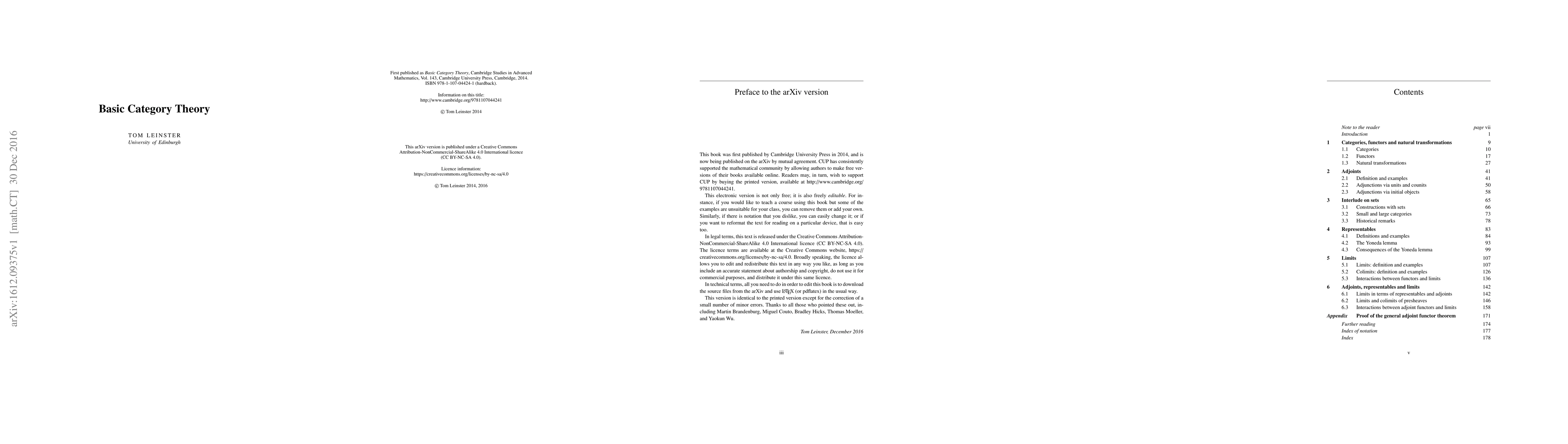 This short introduction to category theory is for readers with relatively little mathematical background. At its heart is the concept of a universal property, important throughout mathematics. After a chapter introducing the basic definitions, separate chapters present three ways of expressing universal properties: via adjoint functors, representable functors, and limits. A final chapter ties the three together. For each new categorical concept, a generous supply of examples is provided, taken from different parts of mathematics. At points where the leap in abstraction is particularly great (such as the Yoneda lemma), the reader will find careful and extensive explanations.